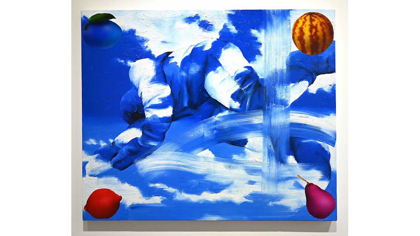 本展では初めて単一のシリーズ「Formless Sky」からの作品を展開する。晴れた空に同化するような人型のダウン、そこにカラフルなフルーツが浮かぶ一見明るい絵画空間は、しかしそこに爽やかな空に得体の知れない存在と毒々しいまでに鮮やかな果物が浮かぶ。そのインパクトにもかかわらず、不思議と重さを感じさせない画面は、現代的な感覚で描く山本の作品の特徴のひとつであるといえる。