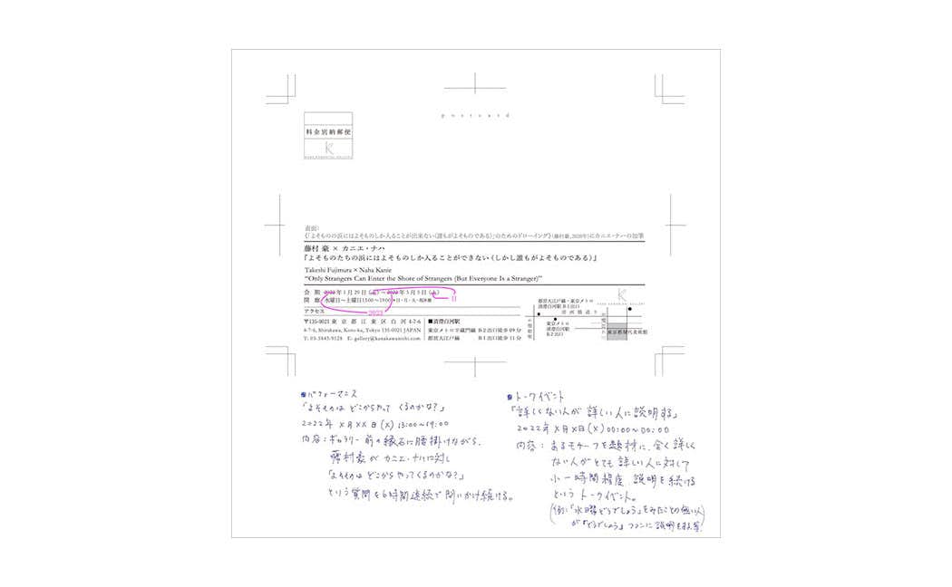 KANA KAWANISHI GALLERYは、藤村豪(ふじむら・たけし)とカニエ・ナハによる2人展「よそものたちの浜にはよそものしか入ることができない(しかし誰もがよそものである)」を開催している。