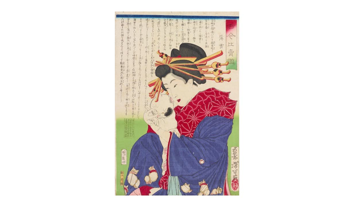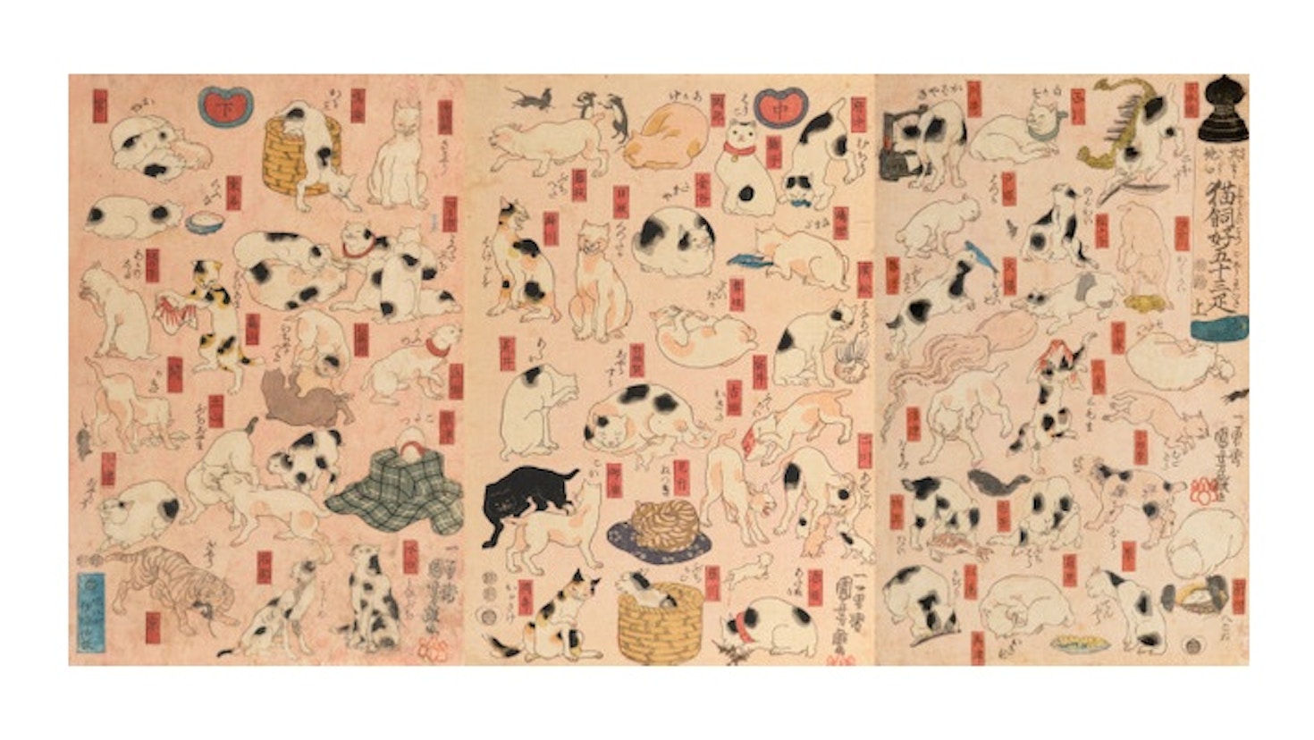 猫は浮世絵に登場する様々な動物のなかでももっとも多く描かれ、擬人化された猫、化け猫に、メス猫の一代記や、ネズミ除けのお札としてまで、あらゆる姿で表現された。