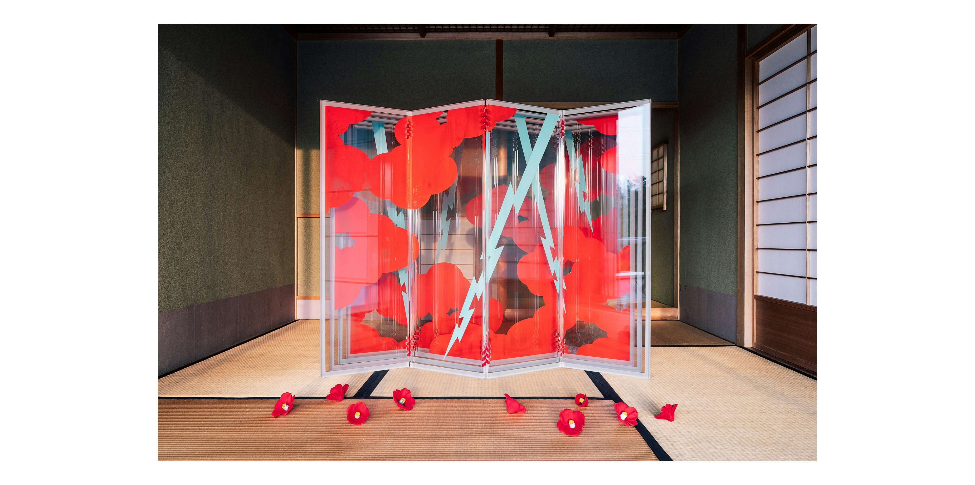屏風型の新作絵画《Descending Painting(Folding Screen)》は、支持体を5層重ねることで絵柄が完成するように描かれたもので、室町時代後期から江戸時代にかけて描かれた「洛中洛外図」から着想を得て制作されたという。