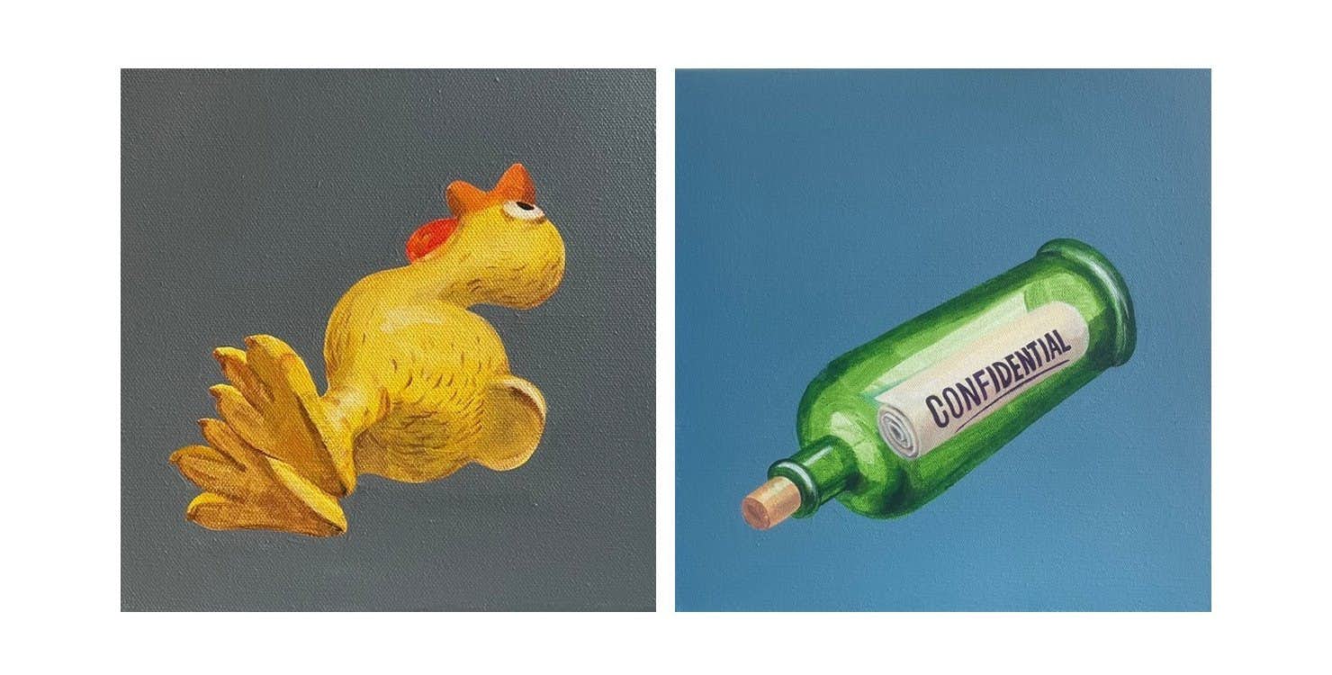 横浜では初の個展となる本展では、「海辺の漂流物(flotsam)」をテーマに、犬用の玩具や海綿など、作家が実際に浜辺で拾い上げたものから、ミロのヴィーナスの片手、瓶に入った機密文書、イカダに乗った放浪犬、ギャングの屋敷の調度品など、明らかにフィクションのものをモチーフとしてミックス。コミック的なスタイルとアートスクール的な半写実の技法を混在させて展開することで、絵画において現実と空想の世界を地続きにすることを試みるという。