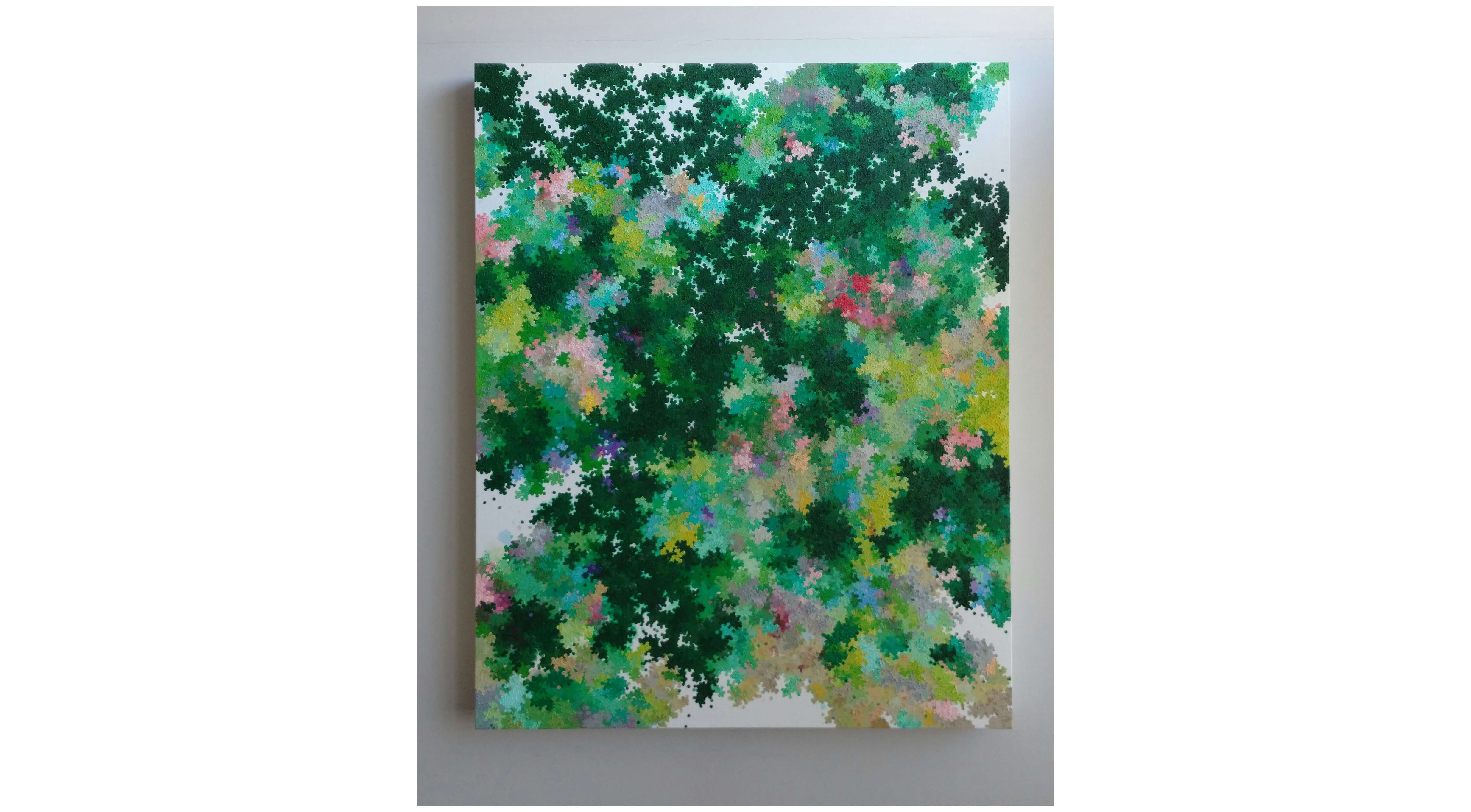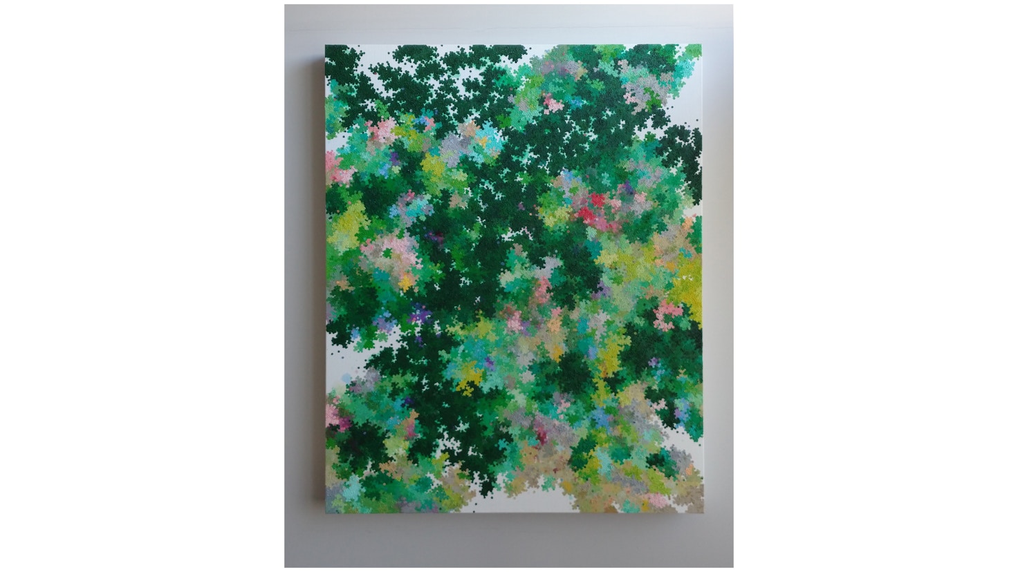 本展ではエルスワーズ・ケリーの「赤・黄・青」を下敷きに三原色で作成した大型作品をはじめ、虹のように色彩が入り組んだ作品や、画面にカーキが入り込んだ作品など、約40点が展示される。