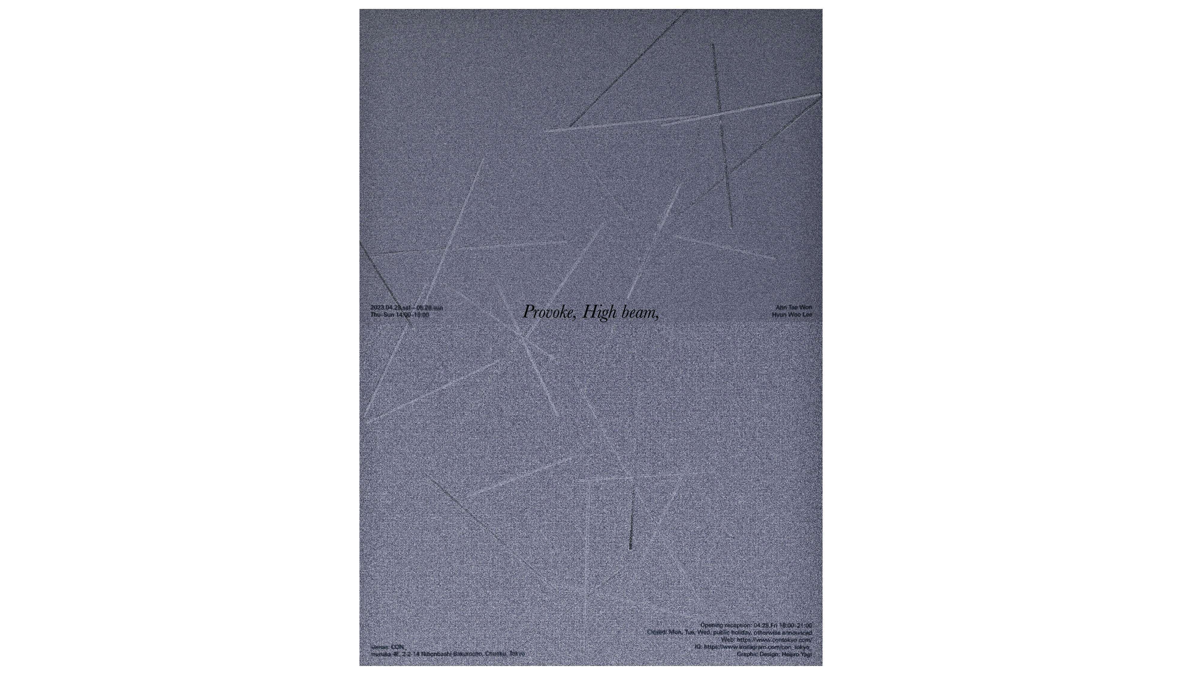 本展のタイトルである「Provoke,High beam,☆☆☆」は、2人の作家性である現実の世界と他世界(インターネット/常世)の交差から着想したもの。会場では、自然環境の対象化をコンセプトとするリ・ヒョヌの大型の彫刻作品をはじめ、インターネット上のミームが現実の世界に組み込まれたような不自然さをコンセプトに愛猫をモチーフとしたアン・テウォンの平面作品や立体作品が展示される。