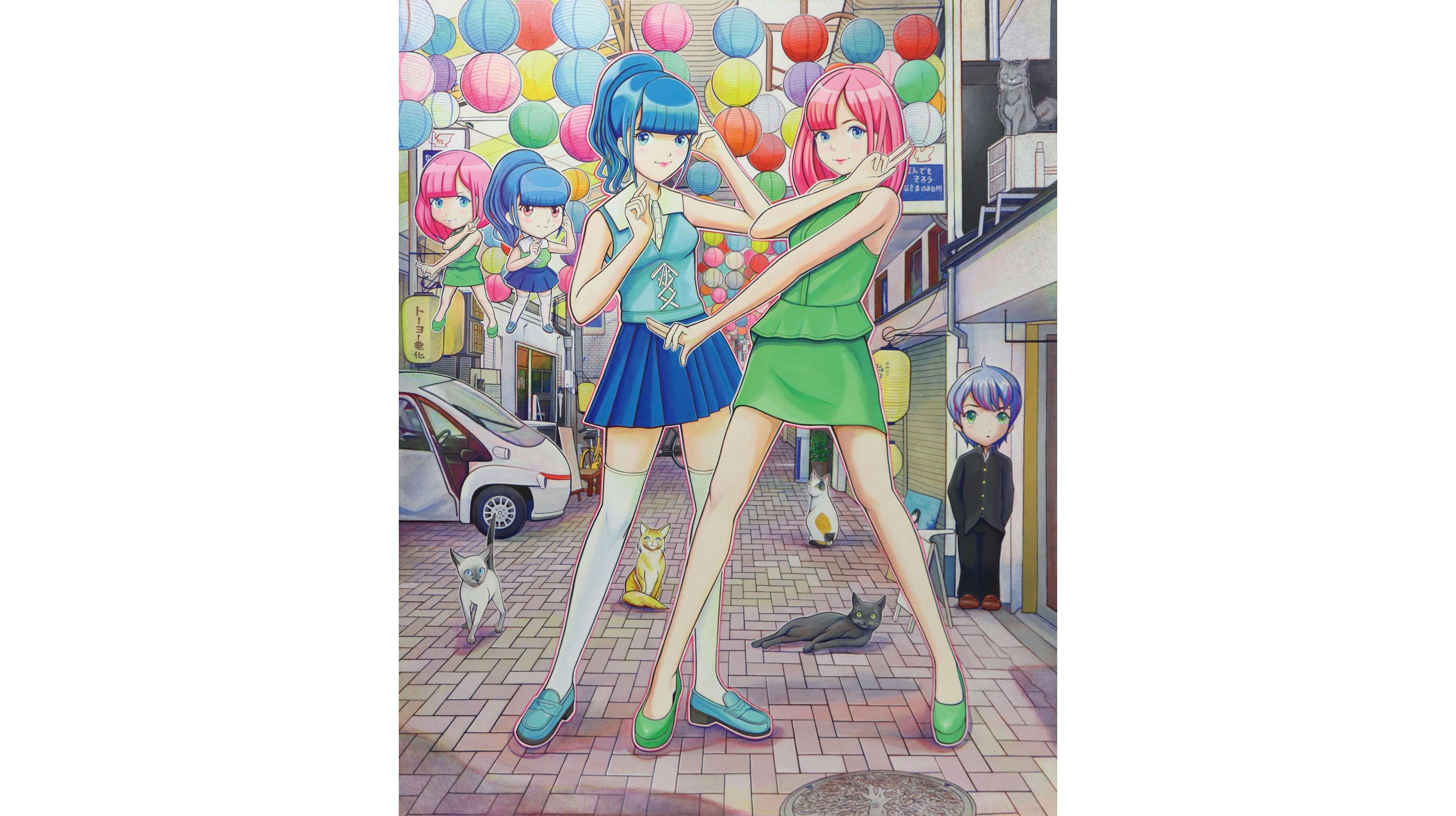 赤松晃年は、ギャル文化や日本のアニメや漫画、ゲームなどのオタクカルチャーを感じさせる「カワイイ」女の子を描くことで知られる現代美術家。アルバイト先で出会った自分とは全く違う存在の「ギャル」に影響を受けてから、2010年以降ギャル文化特有の「盛る」や「デコる」といったキラキラしたものや、アニメ絵に見られる「萌え」や「カワイイ」を織り交ぜた作品を制作してきた。