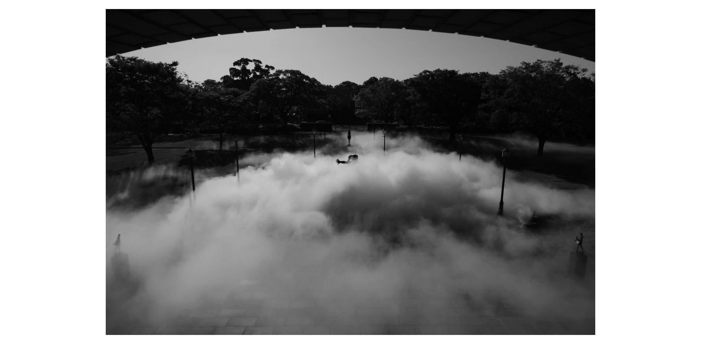 今年度制作された新作《白い風景―原初の地球》は、 「霧の彫刻」3部作の2作目となる。中谷がイメージするのは無垢の地球。そこへ人々が足を踏み入れると、空気が動き、姿が見え隠れして、人の動きが見えてくるという。 「風景を聴く」をテーマに制作された新たな 「霧の彫刻」を堪能する機会となっている。