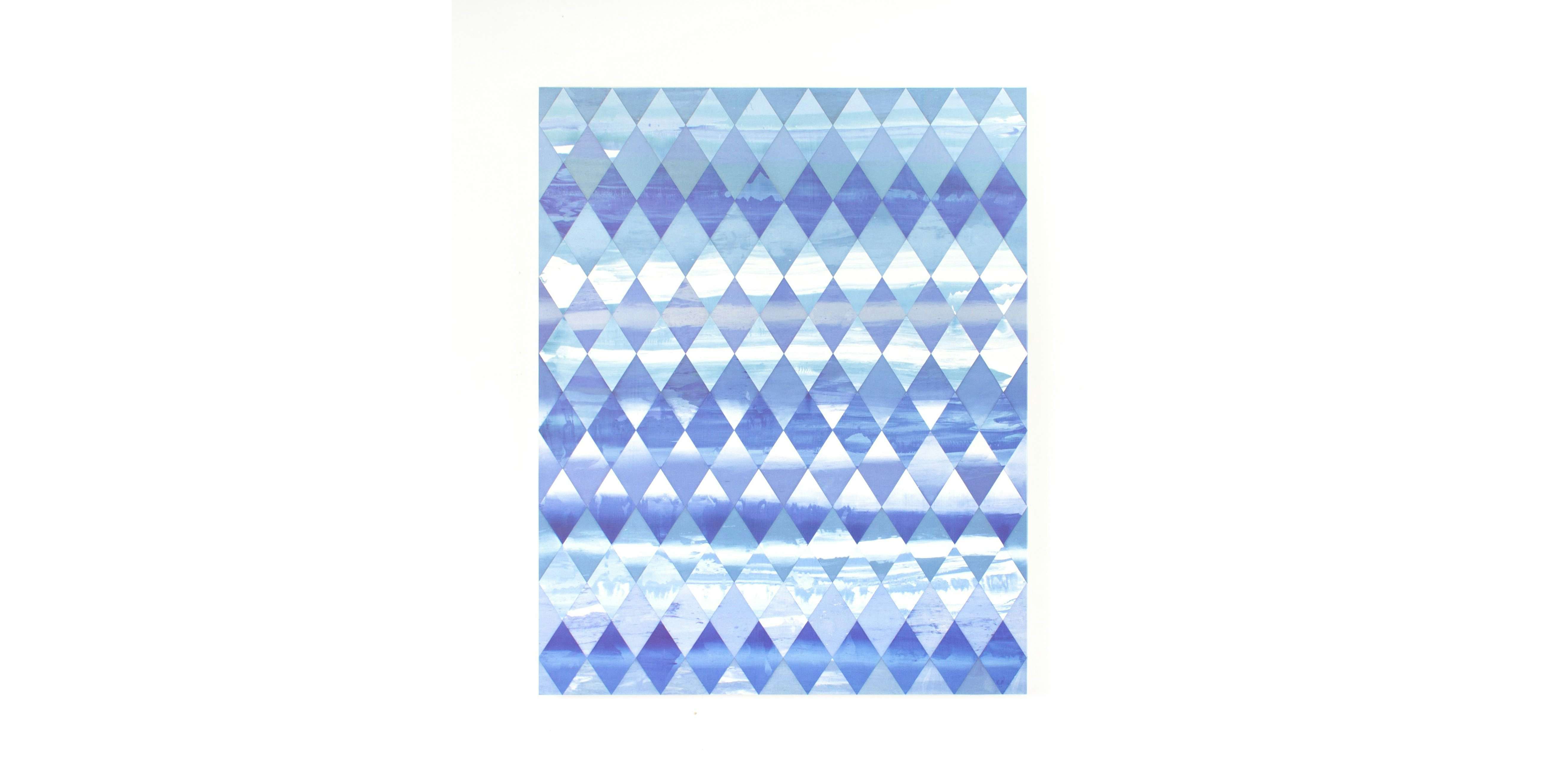 今井恵は、絵の具のもととなるメディウムに顔料を振り掛けて、それをスキージで引き伸ばす過程で顔料を溶かして色を混ぜ、キャンバスに定着させている。その偶然⽣まれる表情は、⾒る者によって、海景や空のようなそれぞれが持つ既知のイメージに変換される。さらにそれらが複数の 「Frame」に区切られたとき、幾何学的なパターンのようにも、並べられた写真のようにも感じられる。