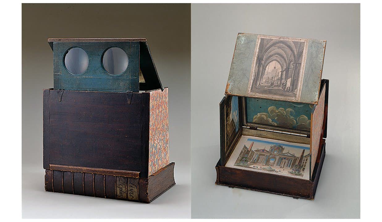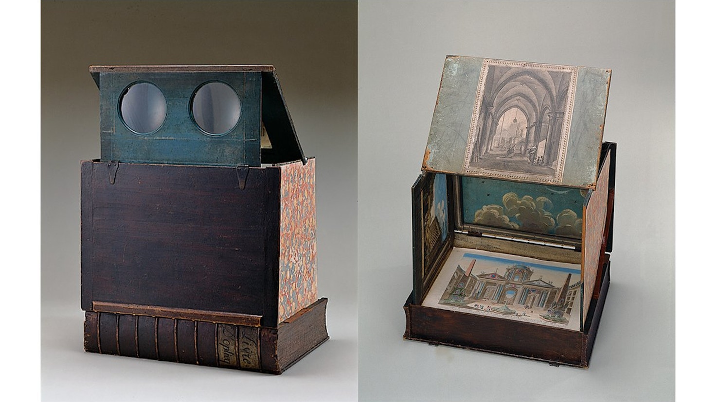 カメラの原型となったカメラ・オブスクラは、その機構を流用することで、遠近法と凸レンズの効果を利用して箱の中の景色を楽しむピープショーとして、18~19世紀のヨーロッパで広く流行した。そのほか覗き見る装置のバリエーションとしては、顕微鏡や望遠鏡などの科学的な装置や、ステレオスコープのような立体視のための装置、動く絵を生み出す装置などが挙げられる。本展では、当時の貴重な装置を、実際に体験できるレプリカを交えながら展示するほか、それらの装置で使用されていた絵や写真も多数紹介。