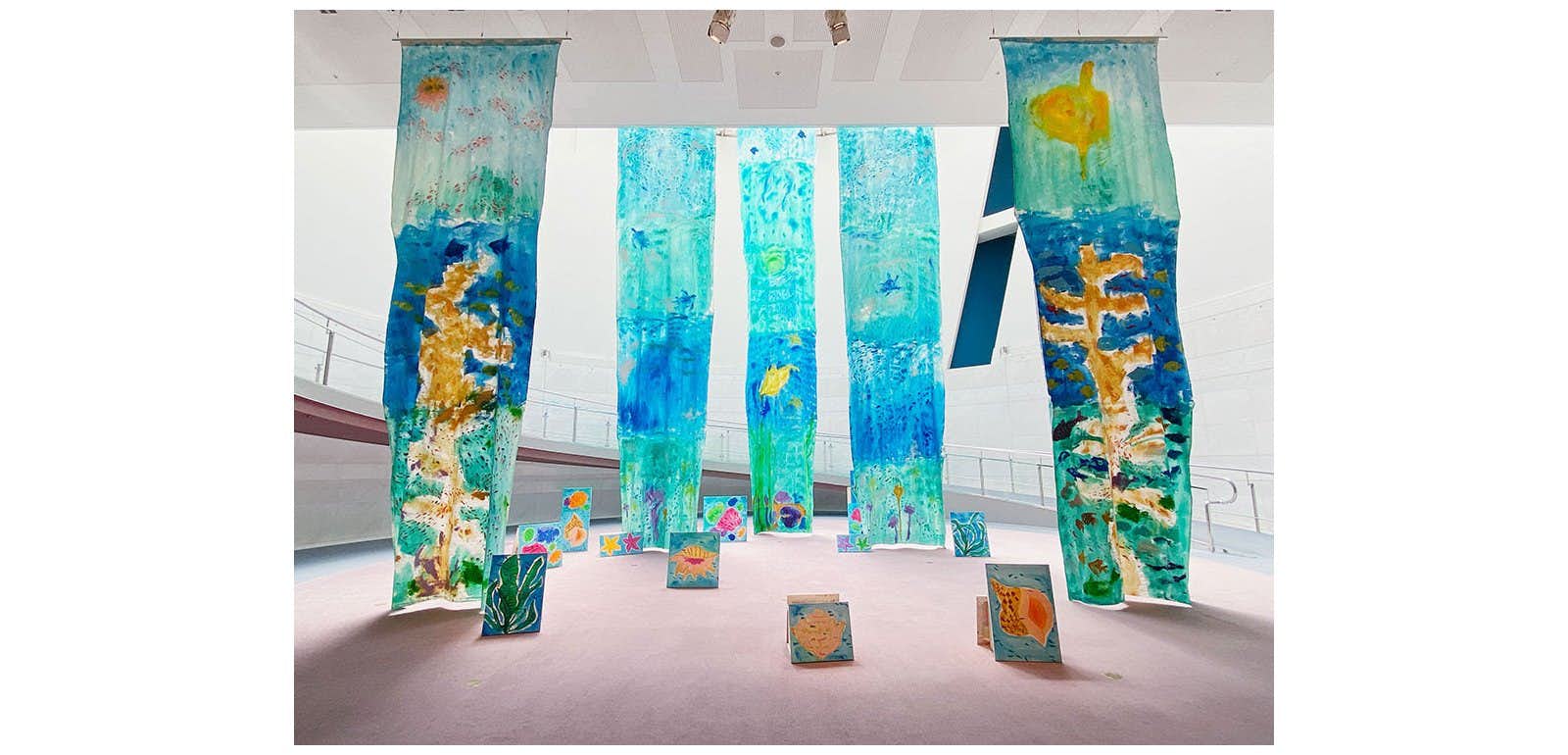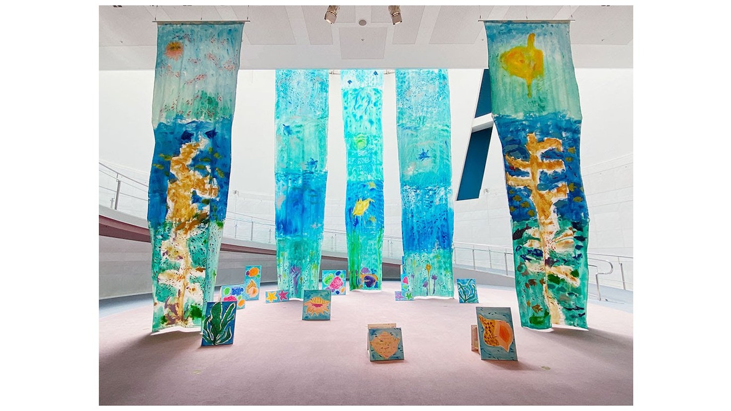 本展では、スパイラルガーデンのアトリウム空間をダイナミックに彩る、海のなかを描いた《水深10メートルの海の底を歩く》(2023)をはじめ、海のなかの生き物や海辺の情景などを描いた新作約50点を中心に紹介する。