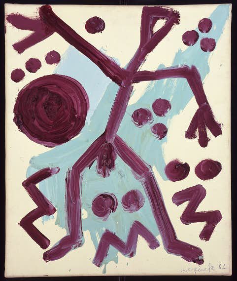 記号や文字がちりばめられた「記号言語」で構成された作品は、原始的な洞窟絵画を想起させ、表現の自由が認められなかった東ドイツで、自身の考えを外部に伝える手段の一つとして用いた簡素化されたモチーフからは強烈なパワーやメッセージを感じさせる。