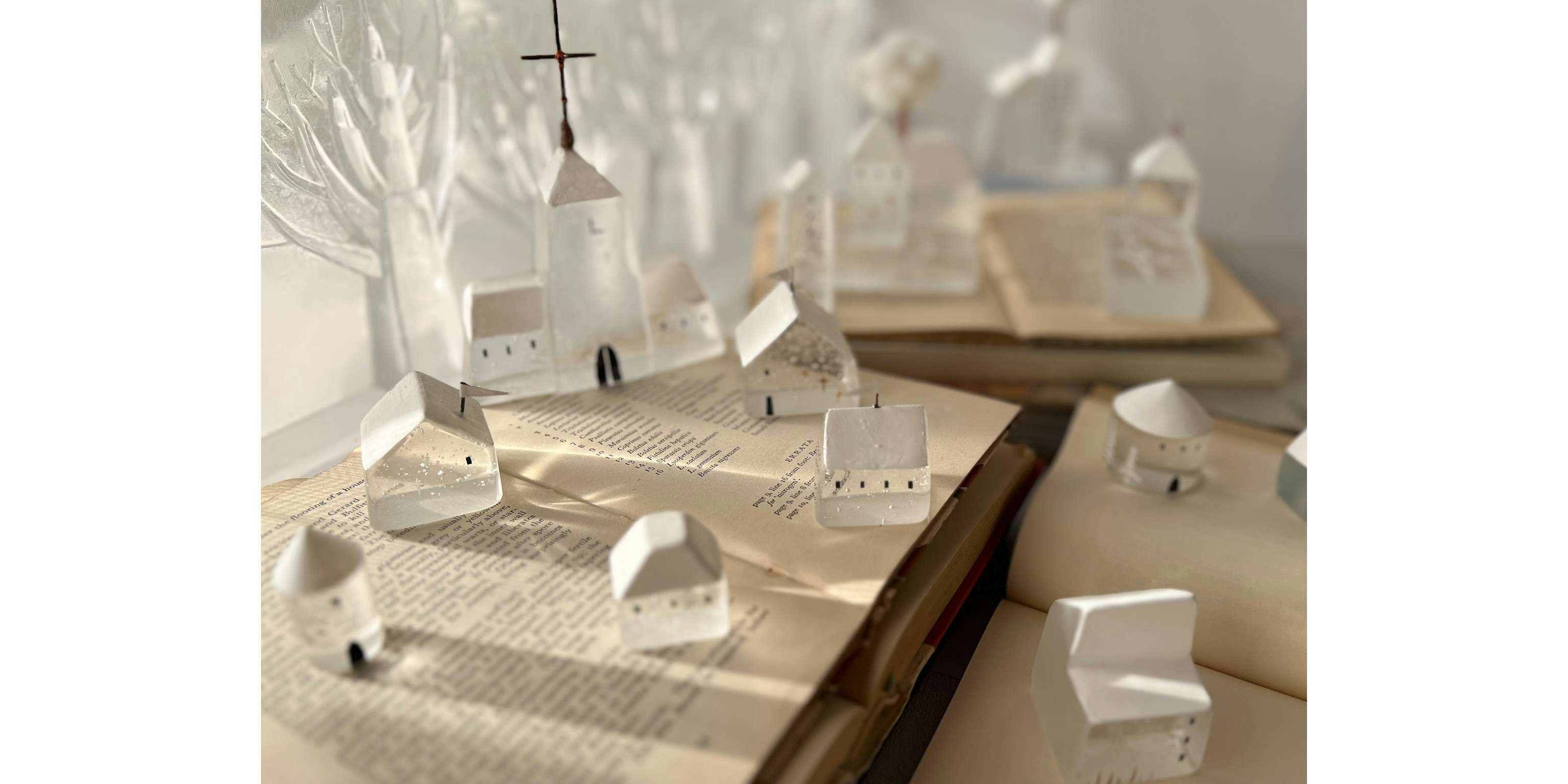 昨年のクリスマスに続き、銀座 蔦屋書店では2回目のフェアとなる今回は、「森の奥にある硝子の街の本屋」をイメージして制作された家や木、湖などをモチーフにした作品を展示する。洋書と一緒にディスプレイすることで硝子の街の本屋の世界観を表現しているという。森から見上げた夏の夜空を表現した新作《七つ星の輝く森》や、三日月の形をかたどった作品も紹介する。
