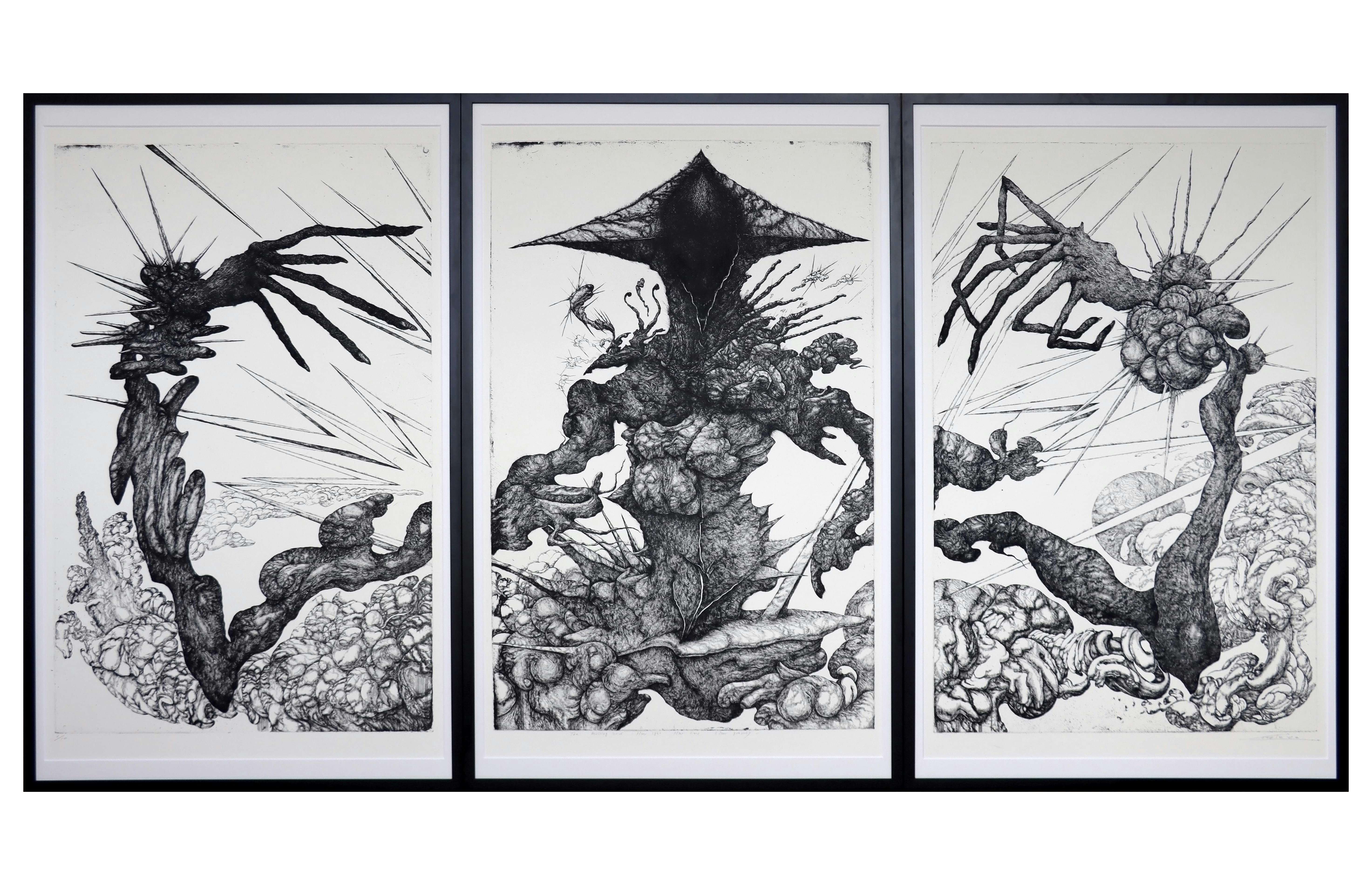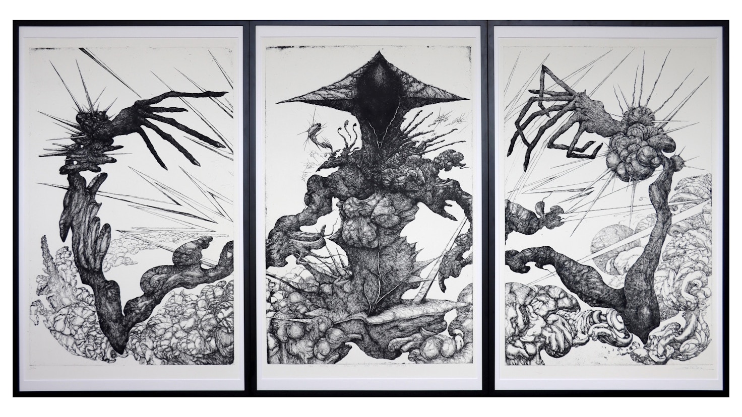伝統と現代、白黒と極彩色など、銅版画の両極で創作を続けているふたりだが、銅という金属板に刻み付けられた痕跡からイメージや思考を汲み上げ、それを強力なプレス圧を使って紙という平面に立体的に定着させこの世に実体化させたいという強い願望を共有している。