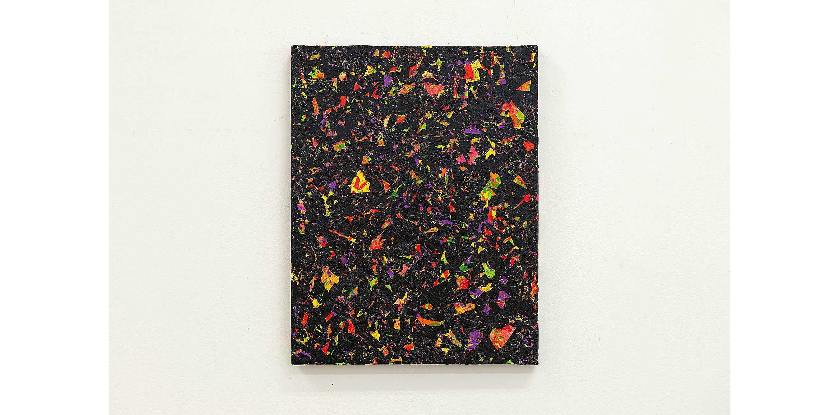 中屋敷智生は1977年大阪府生まれ。近年は、マスキングテープを絵の具同様に使用し、剥離、透過、余白、それらがキャンバスの上で渾然一体となることで、図と地の関係が不明瞭になり、私たちの網膜上に映し出される知覚、直感、思考などの視覚認識がいかに不確定で危ういものなのかが顕在化される。