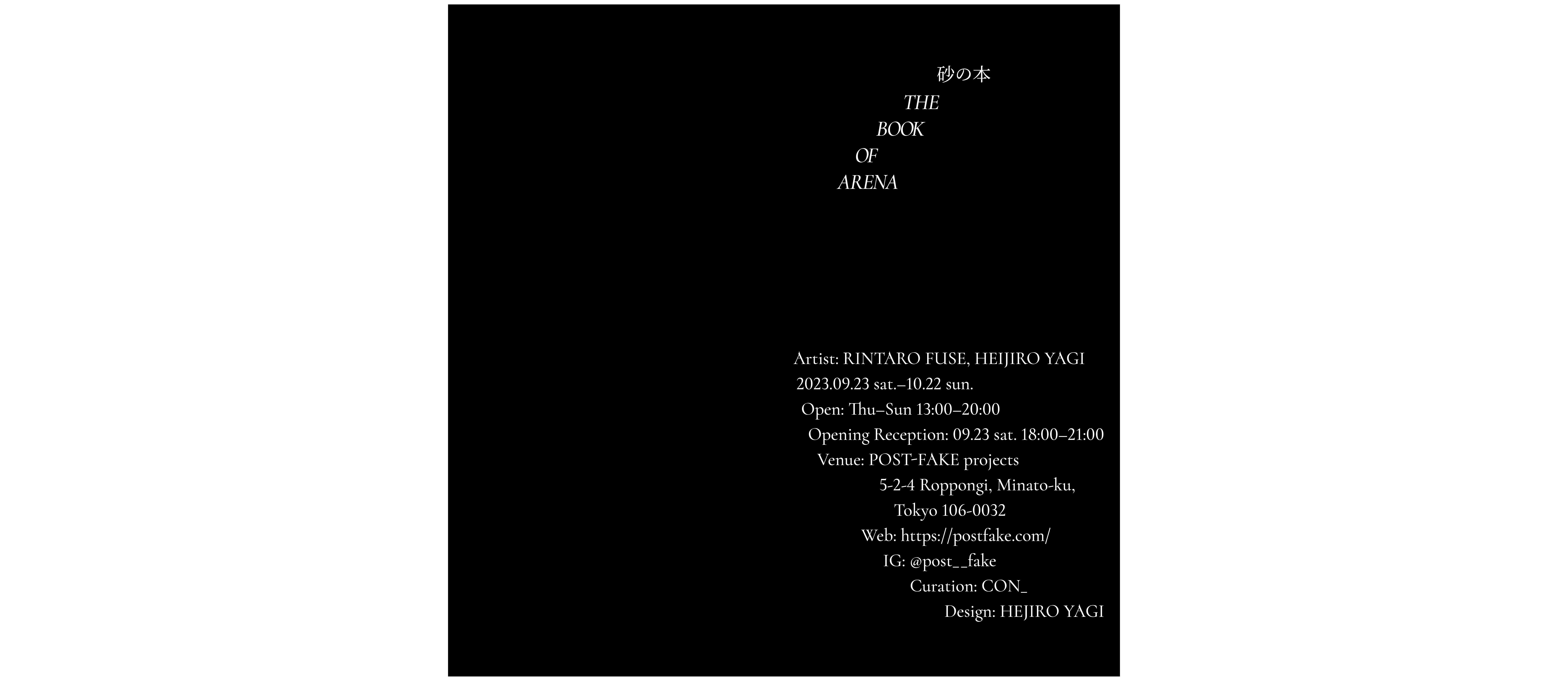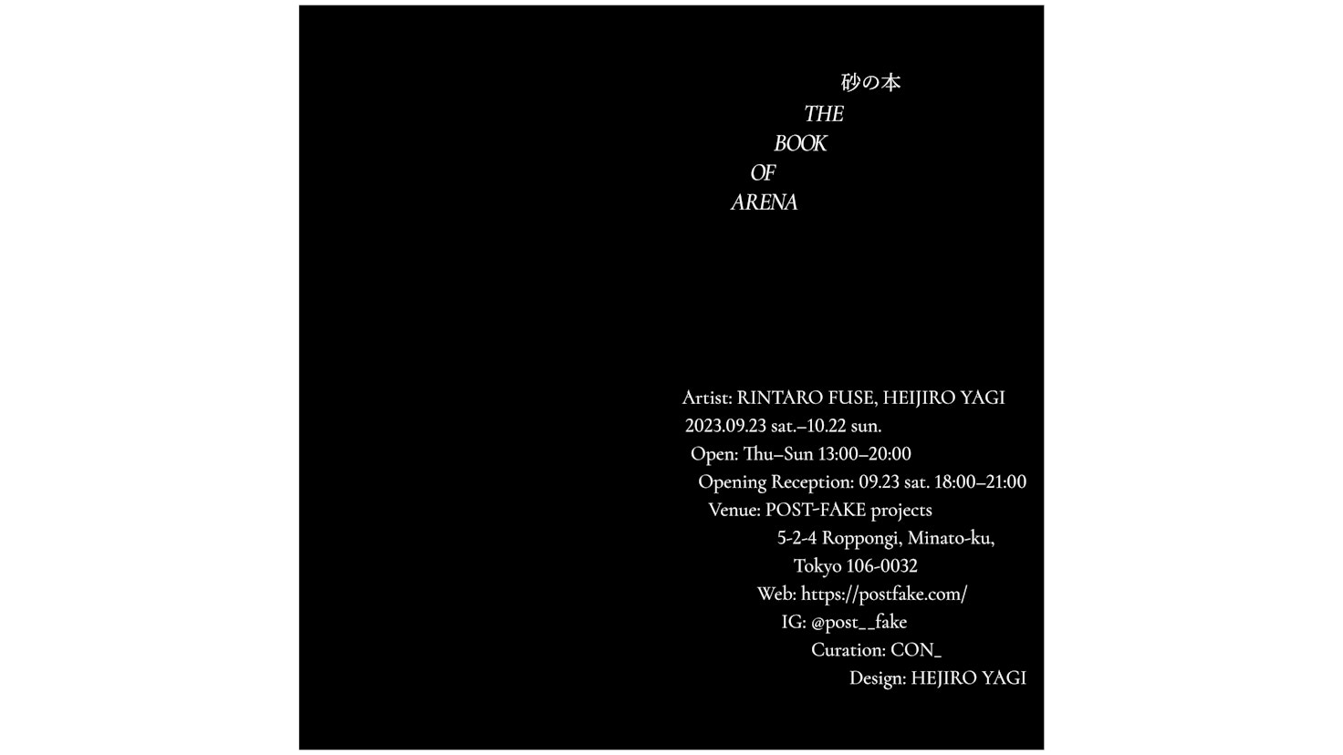POST-FAKE projetsにてアーティスト・布施琳太郎とデザイナー・八木幣二郎による二人展「砂の本 THE BOOK OF ARENA」が日本橋馬喰町のギャラリー・CON_のキュレーションにより開催されている。