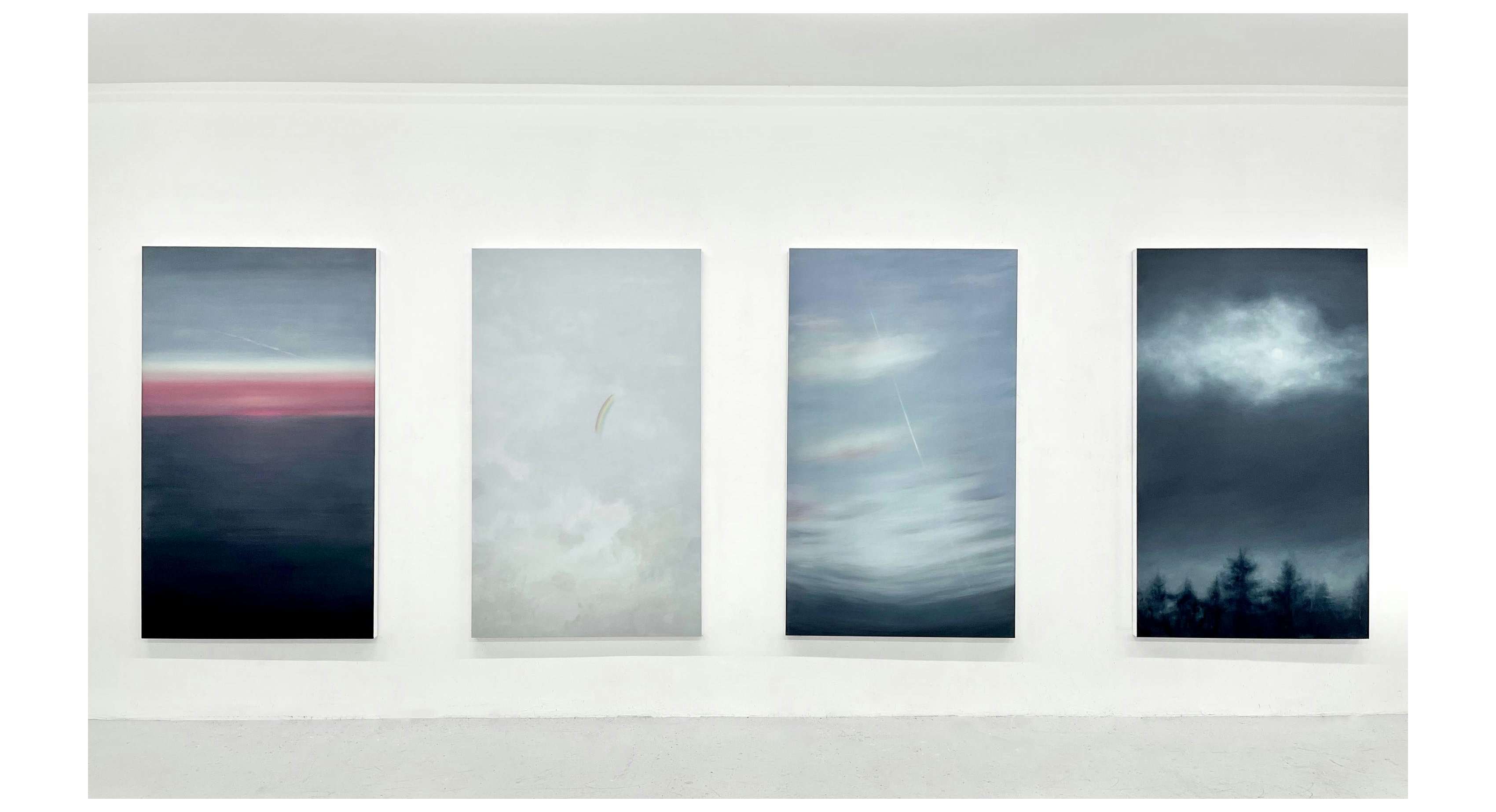 完成された7点の大型キャンバス作品では、夜明けの空、雲の隙間から差し込む光、虹のかかった空、穏やかで静かな空、夕暮れ前の空など、異なる季節や時間帯の空が表現されており、これらを一組の作品として並べた光景は、まるでクラシック音楽の交響曲の複雑な旋律がもつような豊かで広がりのある世界を感じさせる。