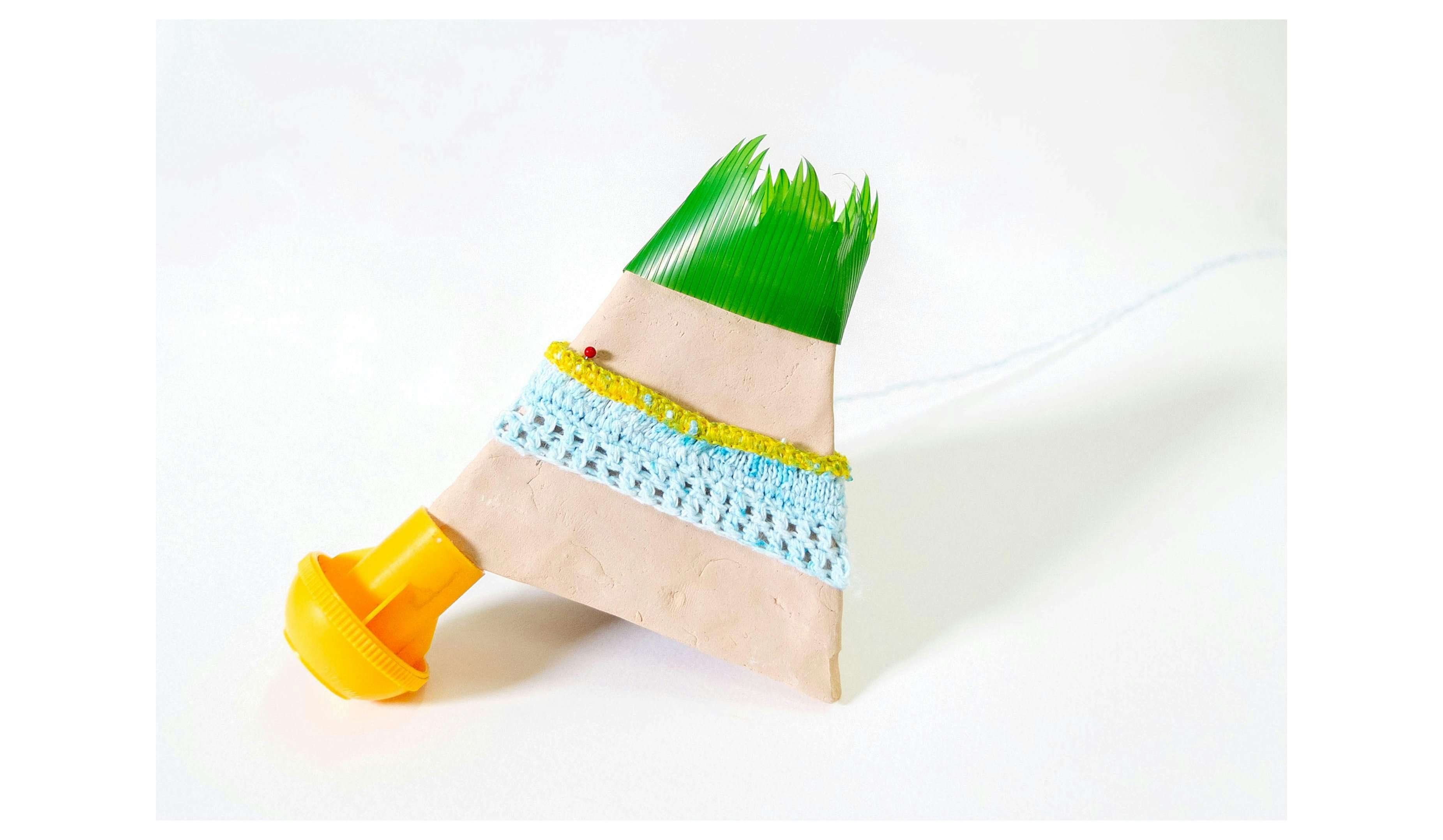 軍手、イヤホンコード、手芸糸など日用品を素材として構造を紐解き、別の何かとそのものとのあいだを行き来するような作品を制作する古屋湖都美と、粘土がある一定の固さになるまでというタイムリミットを設け、脳裏に浮かんだ思い出を形にするまるやまさとわ。曖昧な色味を巧みに使うカラーリングセンスも共通しており、その共同制作作品は、お互いの素材、アイデアが引き立ち合い、二人自身も驚くほどスムースに出来上がった。