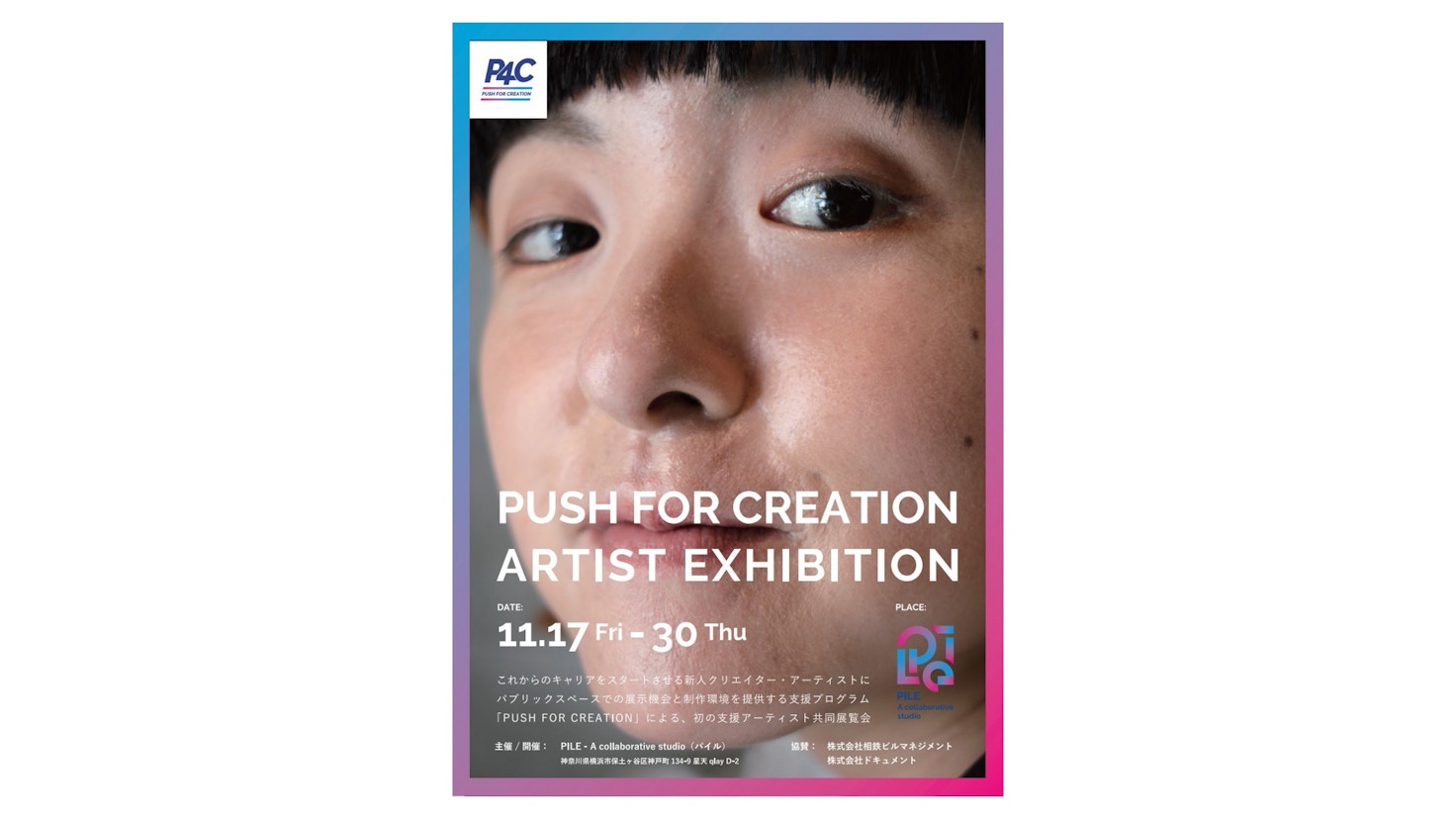 「P4C」はこれから本格的な活動をスタートさせようとしている若手クリエイターや、別の仕事をしながらクリエイターとしてのキャリアをスタートさせようと考えている人に対し、クリエイター向けコワーキングスペース 「PILE」が、パブリックスペースでの展示機会と、一定期間、無償で制作環境などを提供する支援プログラム。展覧会では制作スペースである 「PILE」館内のほか、相模鉄道(相鉄)による協力のもと、相鉄線・天王町駅から星川駅にまたがる高架下のスペースを活用し、地域住民が自由に観覧できるパブリックアートとして、様々な形式の展示をおこなっている。
