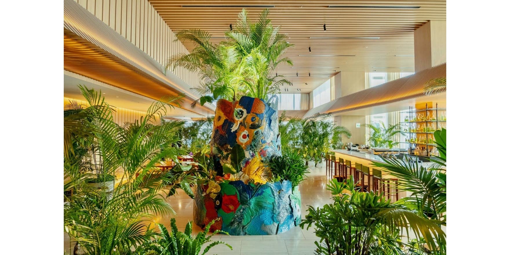 藤元は日本各地の海岸で海ごみを採集し、熱で溶かしながらプレスした海洋プラスチックを素材に絵画作品として提案するいっぽうで、延々と漂着し続ける同素材を建材として「海のバベル」を世界への問いのシンボルとして立ち上げる。本展では、藤元が海岸で見る漂着ゴミが自生する植物に取り込まれ、生態系の一部になっていく様子にインスピレーションを得て、Lobby Barの植栽と融合した「Babel of the Ocean #Nature takes in」を提案する。