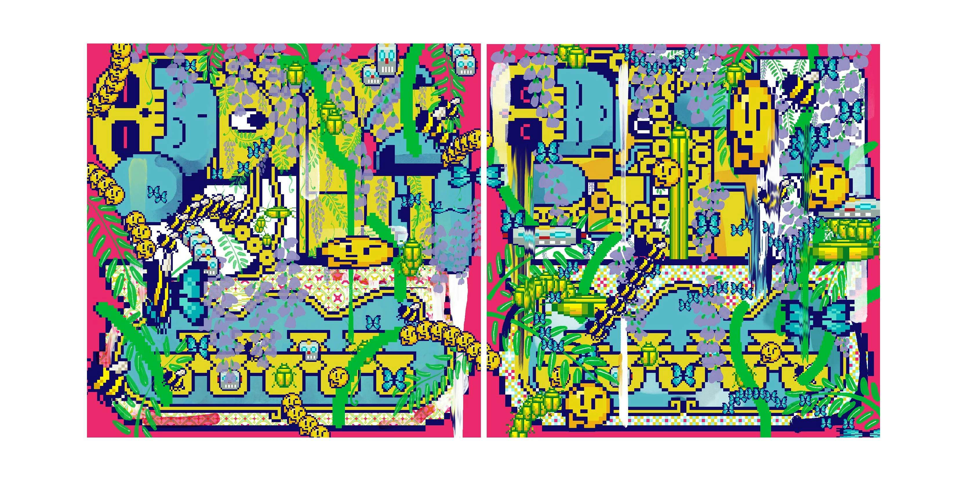 近年は、⽇本仏教や妖怪などをモチーフに、平⾯作品に限らずインスタレーションなど様々な⼿法を⽤いて、東洋思想とデジタルをかけ合わせた独⾃の世界観を創出。「可能性の壺」と題した本展では、⼀⾒同じようで違う緻密な作品を並べることで、真実や正解は複数存在するというテーマを表現している。