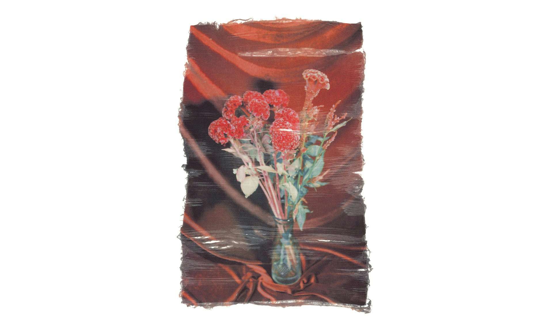 さらに本作は支持体として採用した布に写真を転写、加えてそれらを自らの手で切り裂くという身体的な介入を行い、本来二次元であるはずの花のイメージに新たなる質感を付与させた。儀式的ともいえるそれら一連の過程を経て生まれた作品は、「花の写真」という従来の表現枠では収まらず、別の何かへの変容を感じさせる。本作はのちにアニミズム的な自然観や神聖性をテーマに作品を制作することになる遠藤の原点と言える。