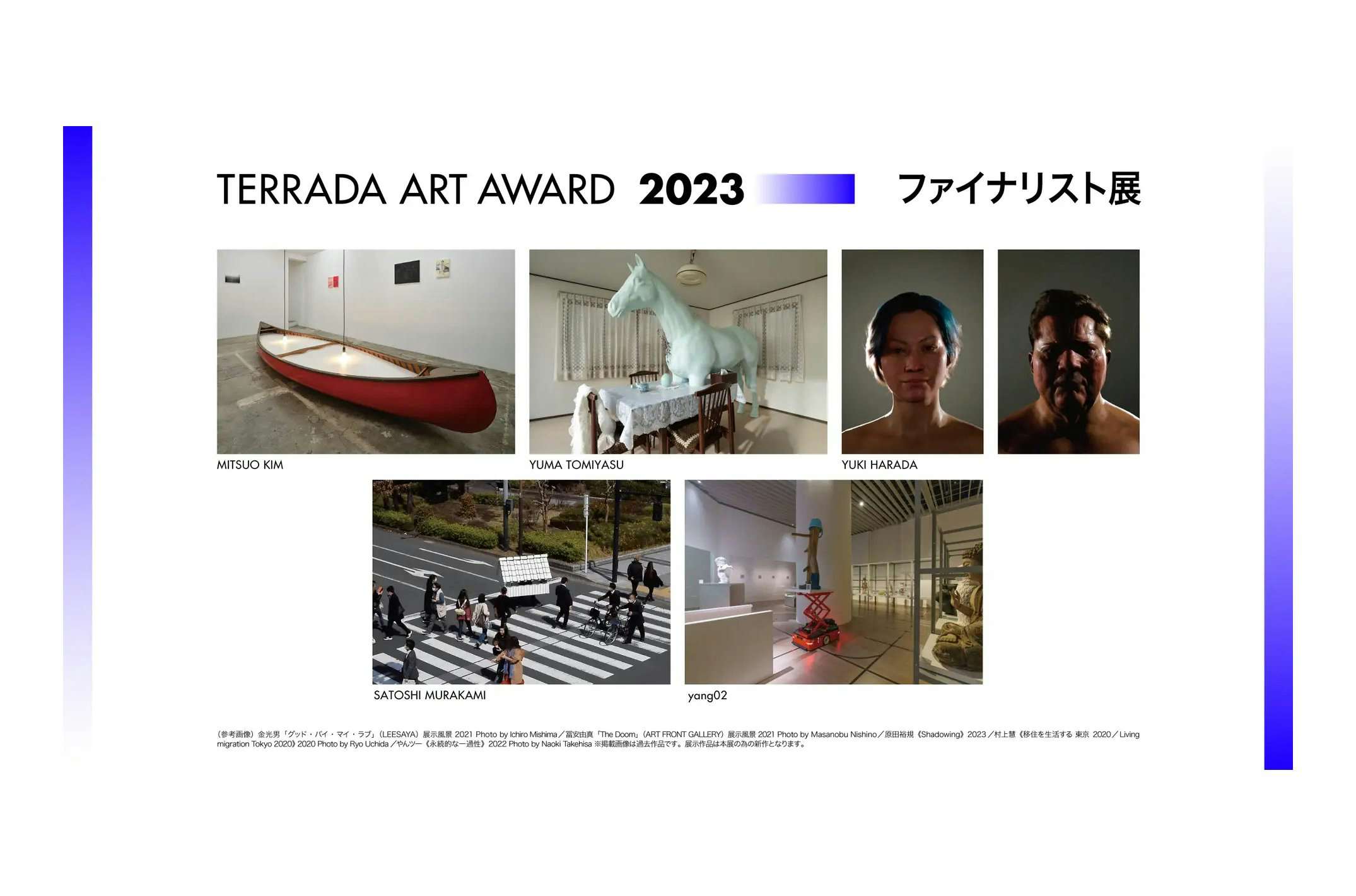 本展では、ファイナリスト5 組が「TERRADA ART AWARD 2023」へエントリーした展示プランを元に独自の展示をつくり上げ、未発表の新作を含む作品を個展形式で発表する。会期初日には、最終審査員の金島隆弘、神谷幸江、寺瀬由紀、真鍋大度、鷲田めるろからファイナリストへ授与する各審査員賞が発表される。