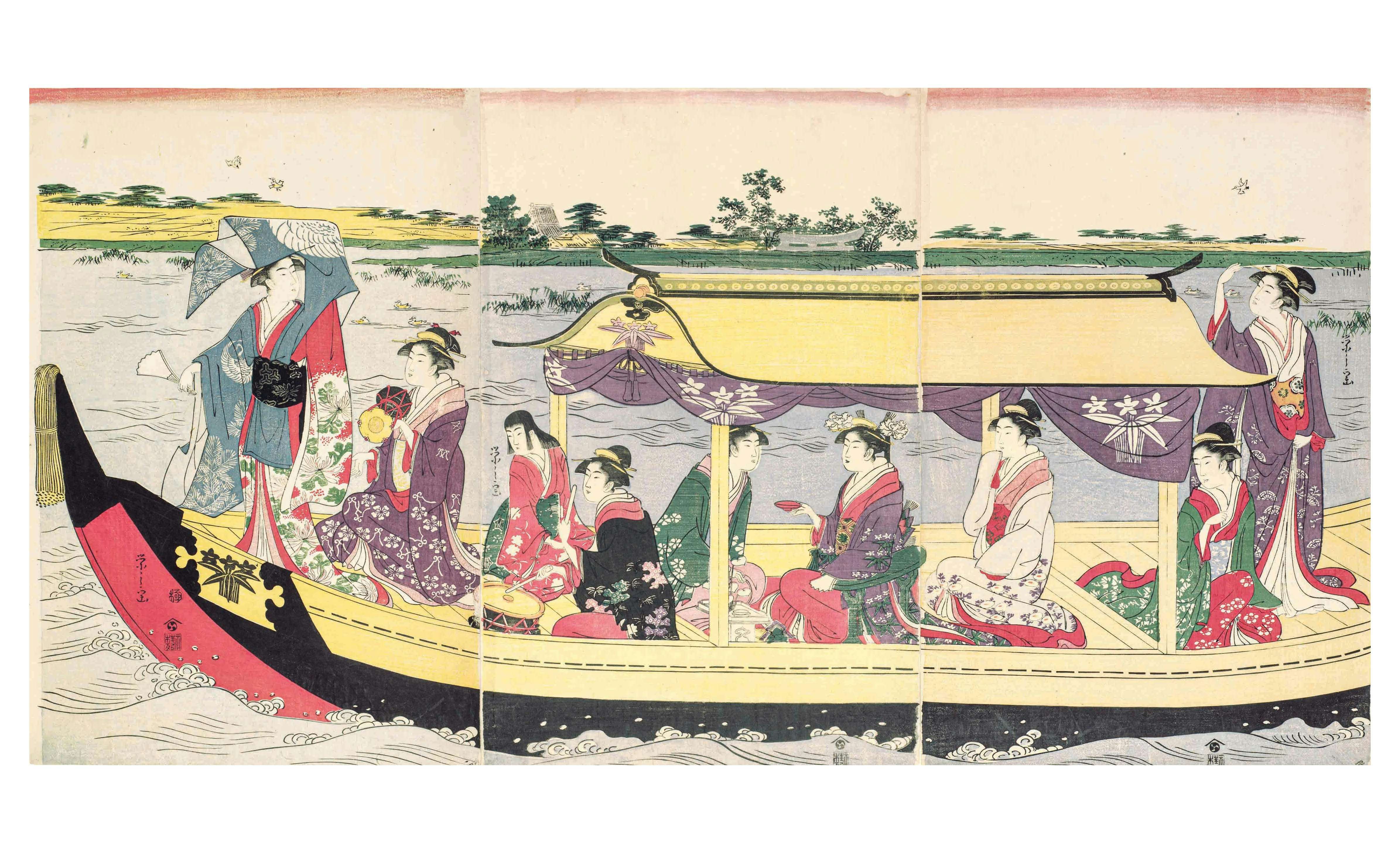 田沼意次(1719〜88)が老中を辞した時代の変わり目のころ、栄之は本格的に浮世絵師として活躍するようになり、やがて武士の身分を離れる。当時の錦絵(浮世絵版画)は華やかな展開期にあり、栄之も浮世絵師として数多くの錦絵を制作、長身で楚々とした独自の美人画様式を確立、豪華な続絵を多く手がけた。寛政12年(1800)頃には、後桜町上皇の御文庫に隅田川の図を描いた作品が納められたというエピソードも伝わり、栄之自身の家柄ゆえか、とくに上流階級や知識人などから愛され、名声を得たことが知られている。