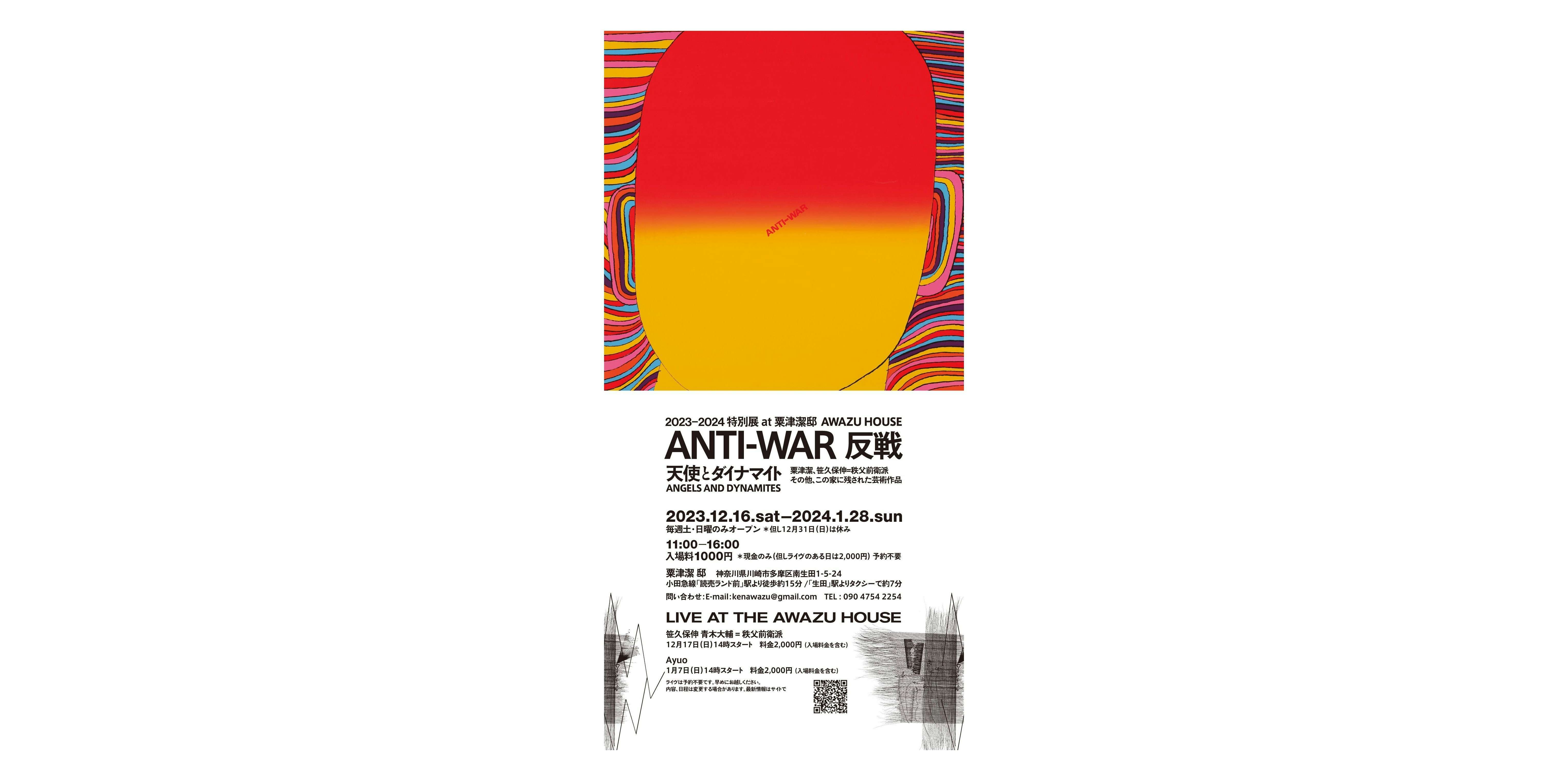 粟津邸で、「2023 - 2024 特別展 at 粟津潔邸 ANTI-WAR 反戦 天使とダイナマイト 粟津潔 笹久保伸 = 秩父前衛派 その他、この家に残された芸術作品」が開催されている。