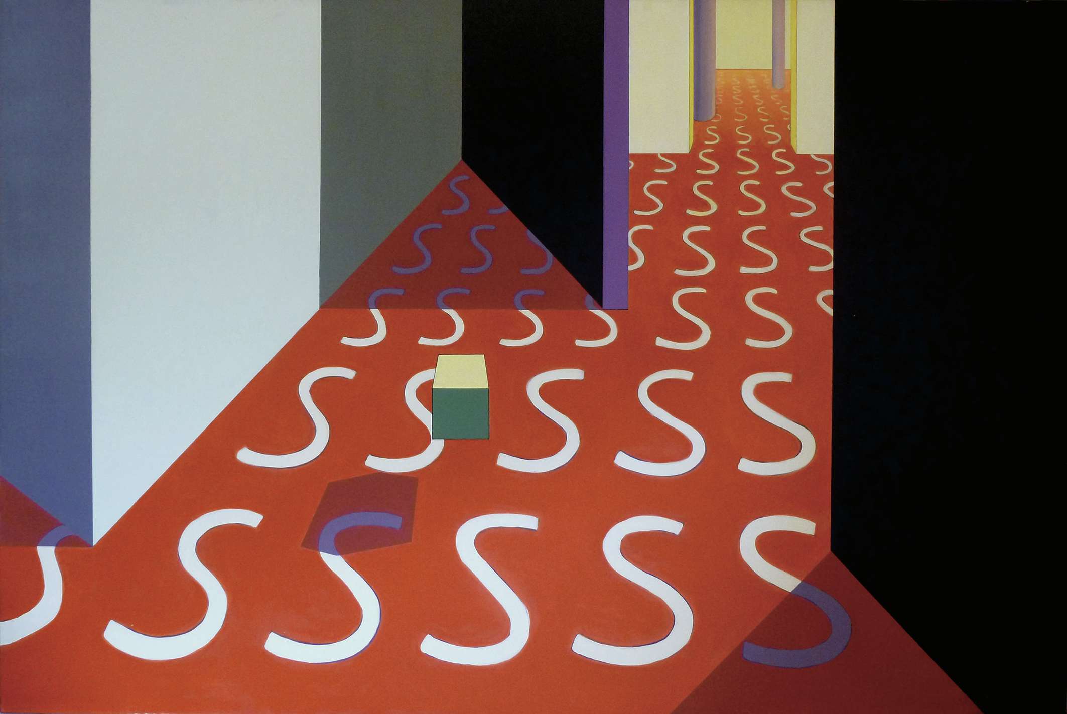 本展では、70年代の平面作品を中心に数点を展示すると同時に、89年の自身の個展「想図〈Sの迷宮〉」を考察するインスタレーションを発表。「S」の記号と共に、迷宮のような構図が描かれたキャンバスやガラス片、ボール紙が壁面に配され、直感と想像力を働かせながら多次元空間を浮遊するかのような空間をつくり出す。