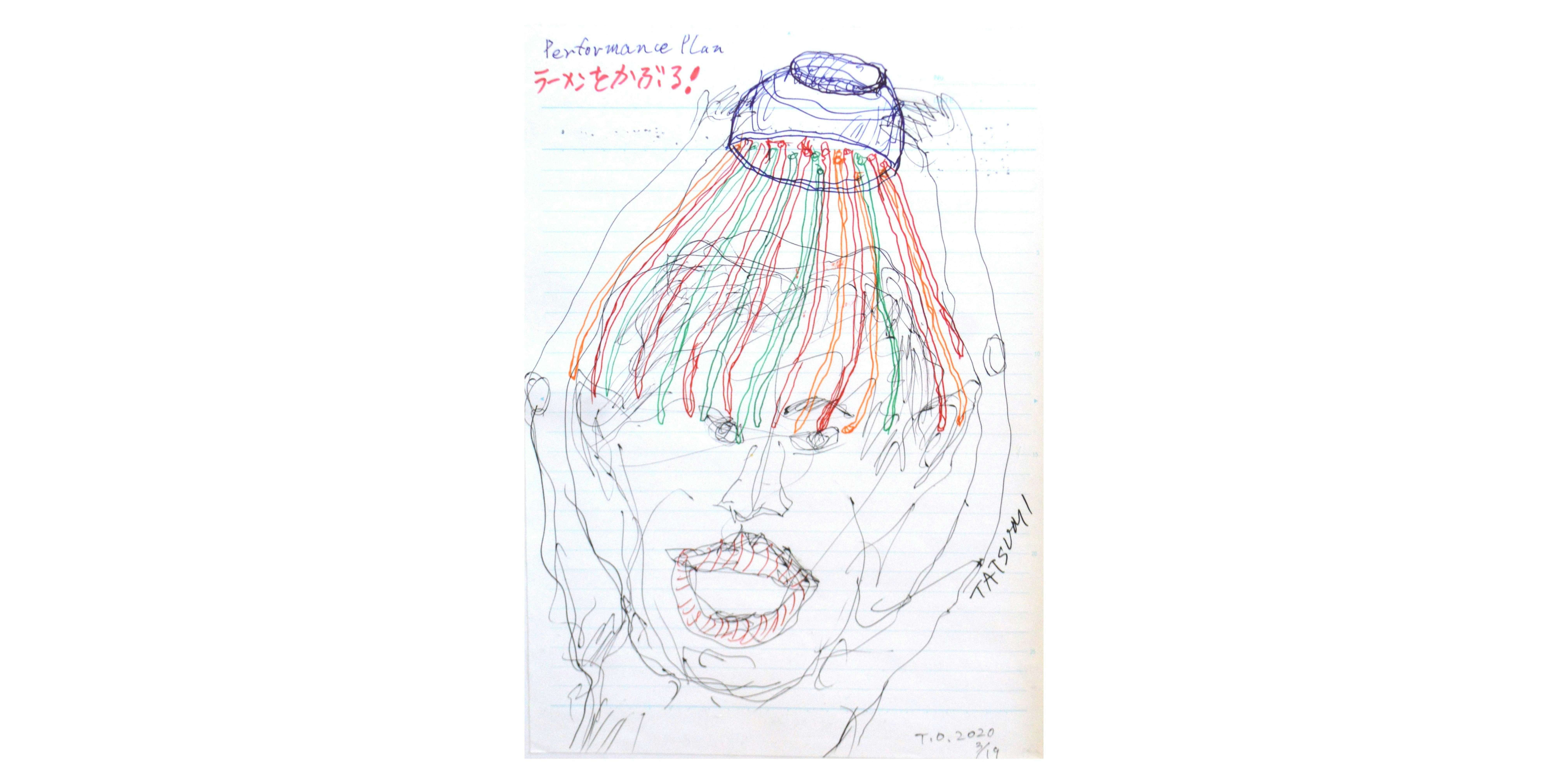 本展では、新作のパフォーマンス《ラーメンをかぶる》を公開。災害によって閉ざされ、役割を終えつつある空間に、折元は佇み、この世界に生きていくこととは何かという根源的な問いを、観者へ投げかけ続ける。