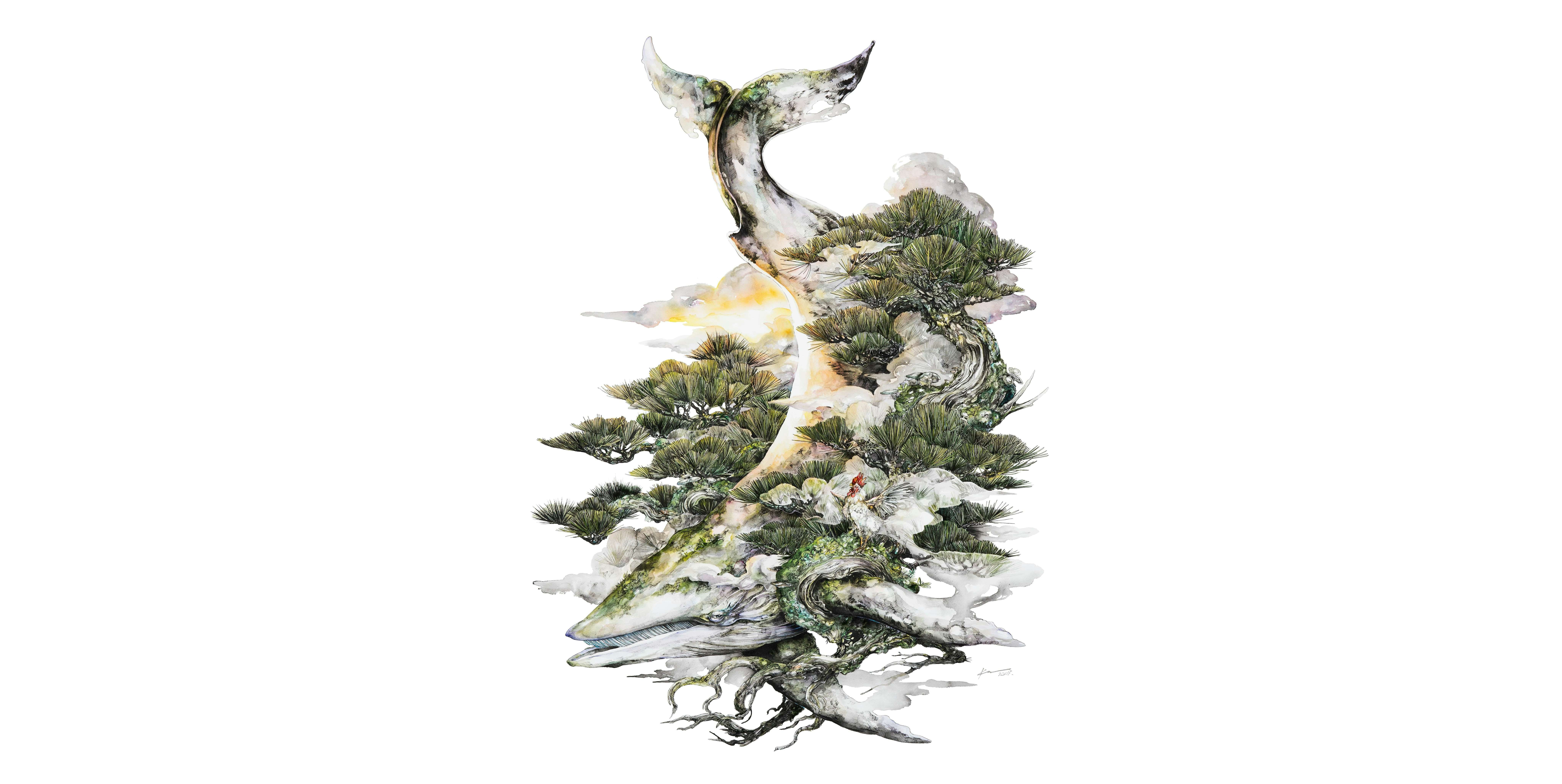動物と植物の共生をテーマに制作された作品は、繊細ななかにも躍動感があり、生きるエネルギーを感じさせる。イラストレーターとして作品展を重ね、6年目となった。動物と植物の「共生」というメインテーマの作品群を描き進めていくうちに、色やかたちの並びにこだわりがあり、そしてそれが自身の魅力であると気づき始めたマツダケン。