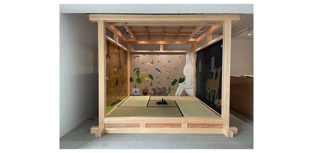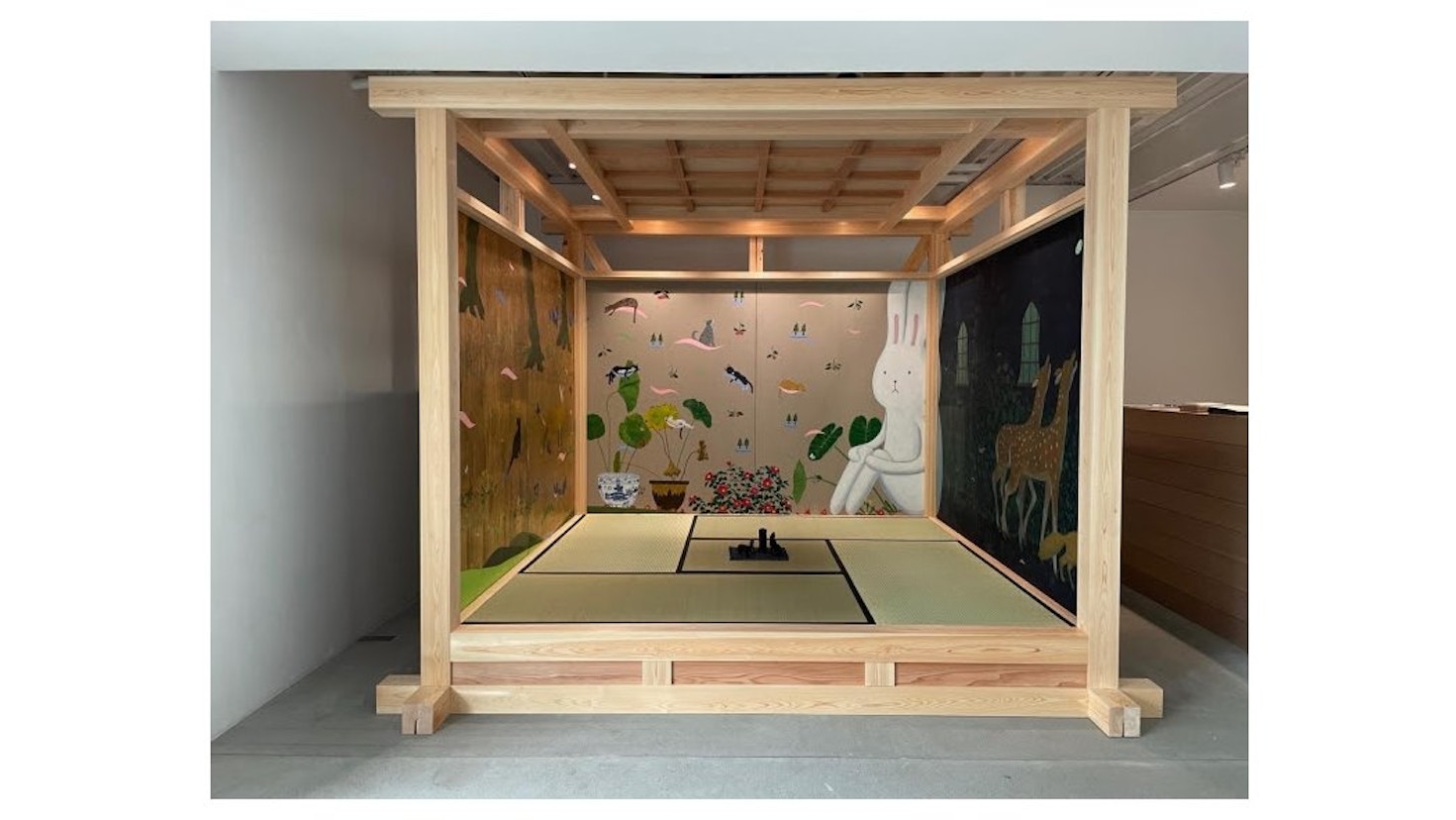 本展では、6枚のキャンバスに描かれた連作のペインティングが、天然木の柱と畳で構成された設えを取り囲むように配置。過去の加賀の個展とは異なり、それぞれの絵画はギャラリーの壁に掛けられることはなく、複数のキャンバスは室内空間を構成する要素として組み立てられ、ひとつの絵画的な世界をつくり出す。