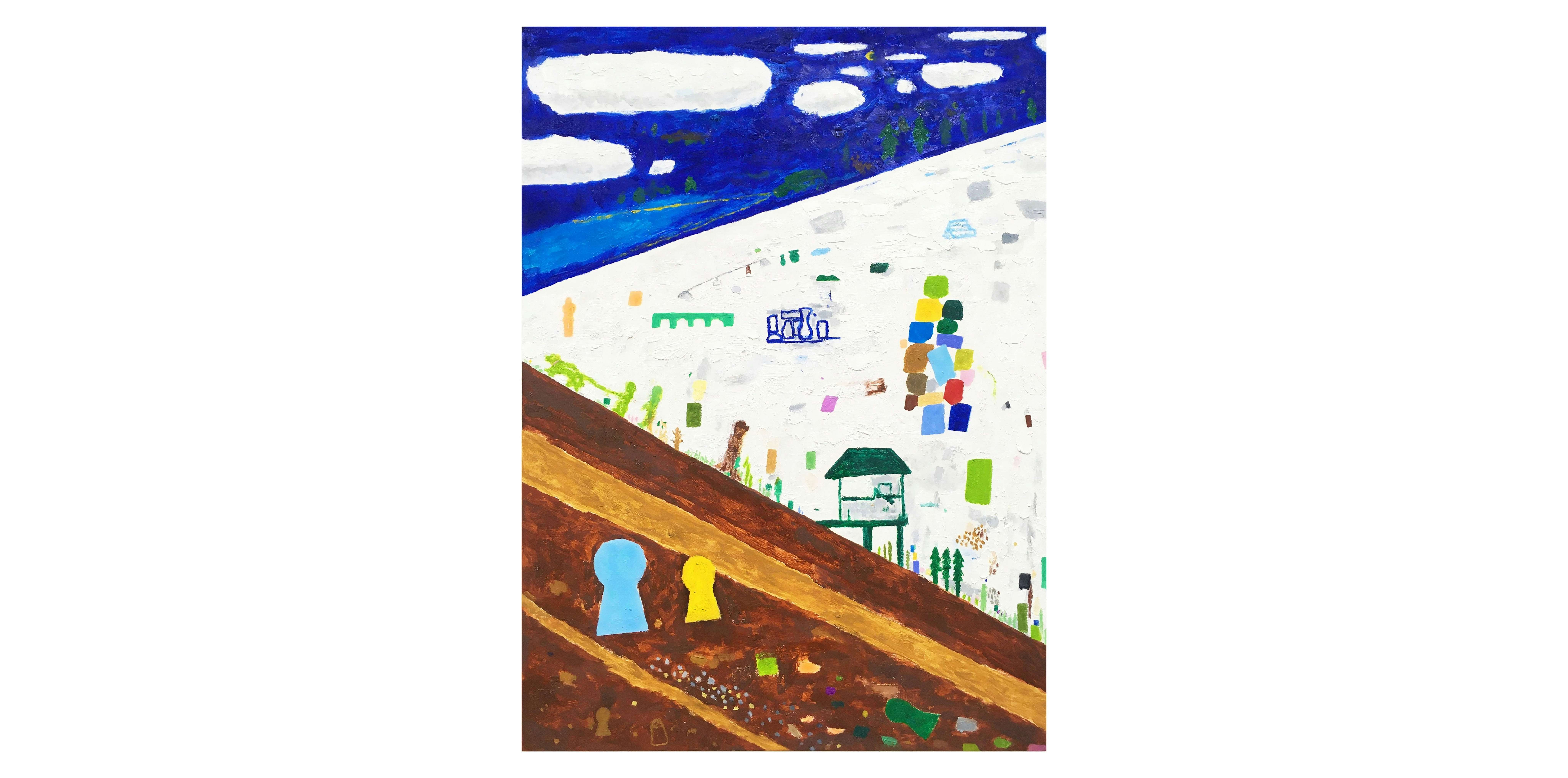 自身が生まれ育った群馬の町並みや山、田園風景などをもとに、群馬に多く点在する古墳や埴輪、人物や物などを配置することで、その土地の持つ時間や記憶、そして自身の積み重ねてきた記憶をキャンバス上に描く衣真一郎は、そこに三次元と二次元の視点を意図的に混在させることで、風景の前後、そして奥行きを探ってきた。