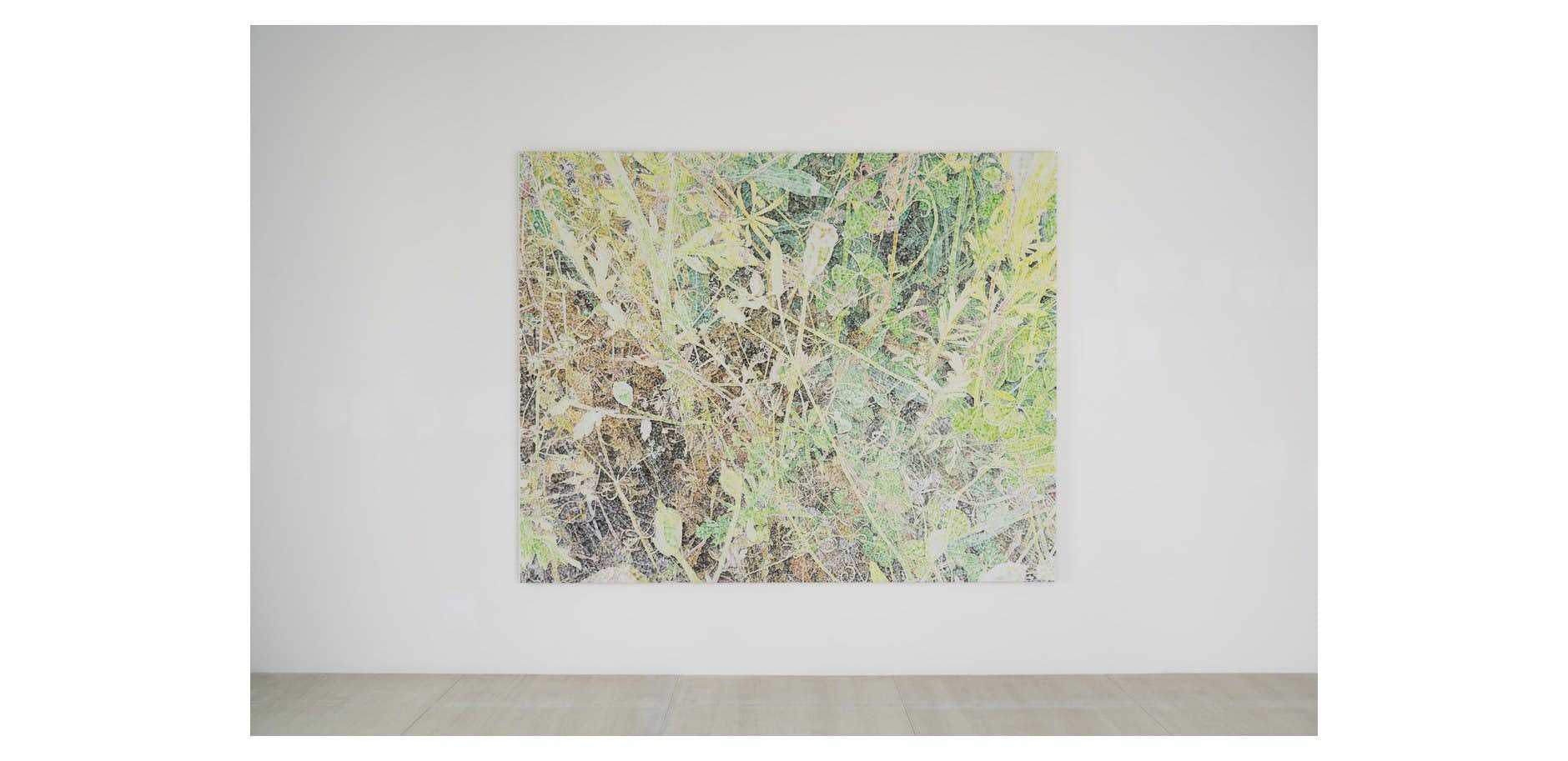 井上は初期より草むらや身近な草花、虫や蝶などを油彩で表現してきた。モチーフからすると写実的に見えながら、下塗りを施さないカンヴァスに細かい筆致で絵具を並べていく描法は抽象絵画と見まごうものであり、その落差は観者の視覚を幻惑させる。