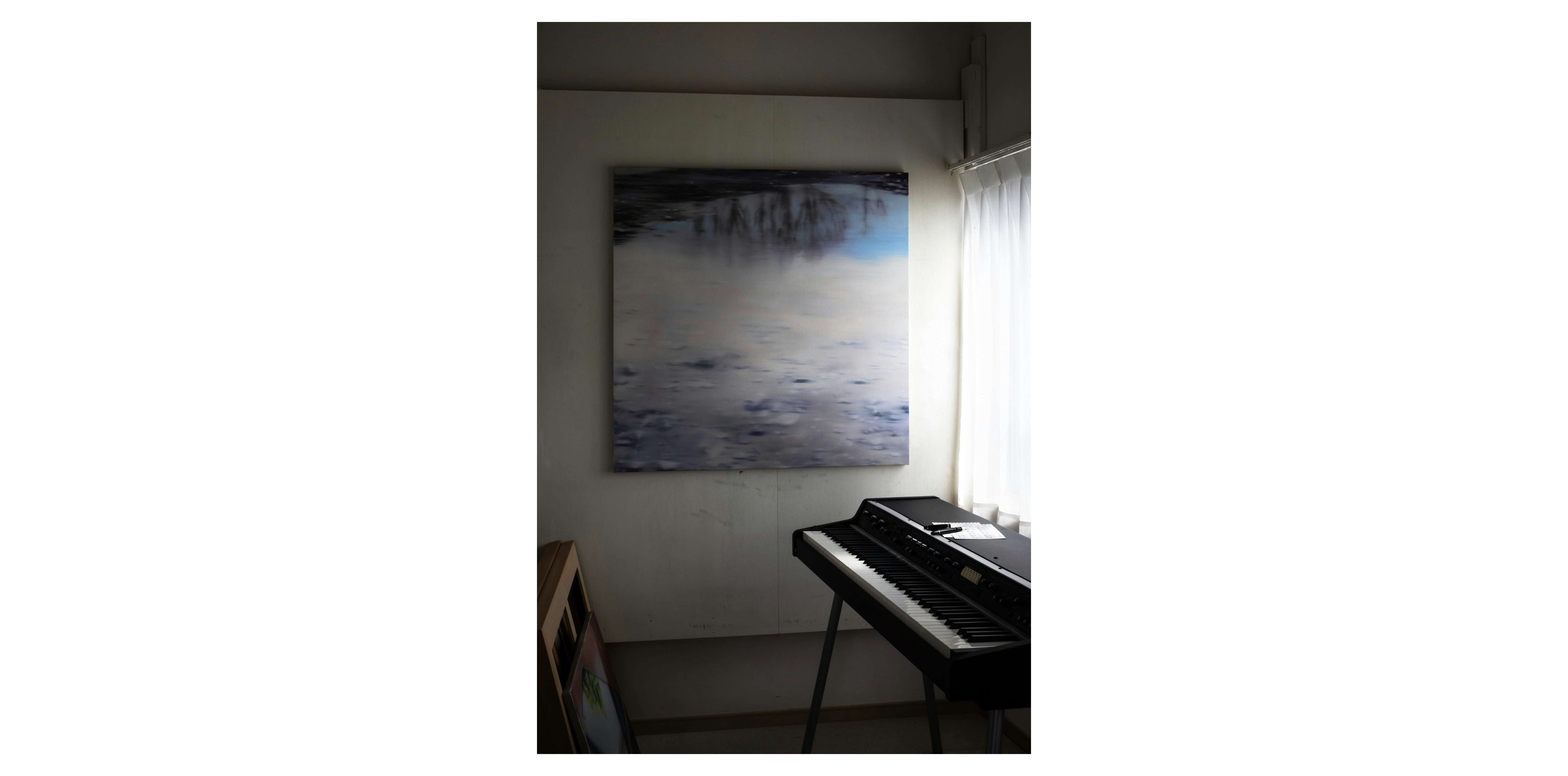 山口幸士の景色、光をとらえたペインティング1枚ごとに、江﨑文武がその風景からインスピレーションを受けて楽曲を制作。絵画と音楽が一体となったインスタレーションが実現した。本展では、キャンバスと譜面を並べて展示し、自動演奏のピアノがその空間で曲々を奏でる。