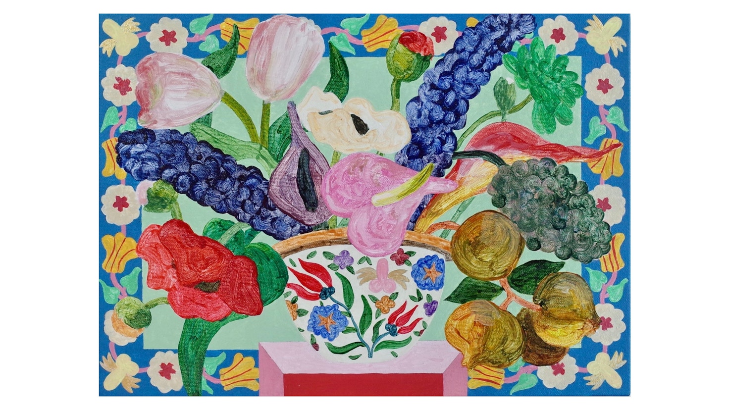 門倉の描く花たちは自由に咲き乱れ、花瓶から大きく飛び出している。主として静物画の題材となる花や果物が、門倉の作中では平面的でありながら躍動感に満ち、描くモチーフすべてが主役でありながら個が共存。キャンバスから溢れるユニークなモチーフは、花=美しいという明快さの枠を超え、こちらに向かって飛び出してくる動きを感じさせまる。