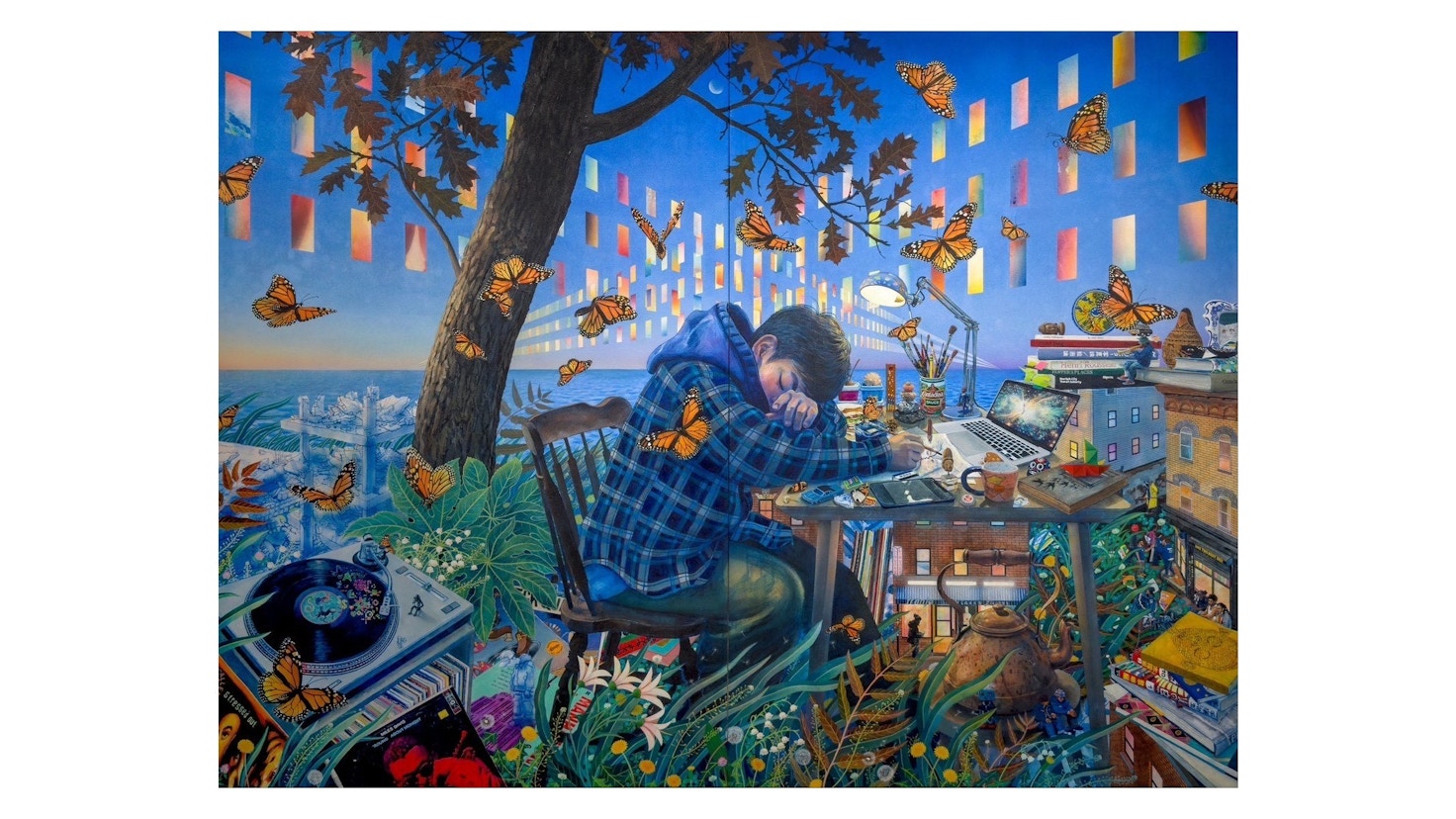 本作は、中国の思想家・ 荘子の「胡蝶の夢」のエピソードを読んだ時の記憶とあわせて、過去にニューヨークの道端でこの蝶に遭遇した時の記憶や、ニュース番組で見かけた蝶が描かれたプラカードを掲げた人の姿など、岡安が微睡(まどろみ)のなかに見た様々な記憶の断片をつなぎあわせて描かれている。一枚のキャンバスのなかで現実と夢、日常とオンライン越しに見る遠くの世界、過去と未来など、相反する世界が交差して、自由に飛び交う蝶がその二面性の共存を表現。