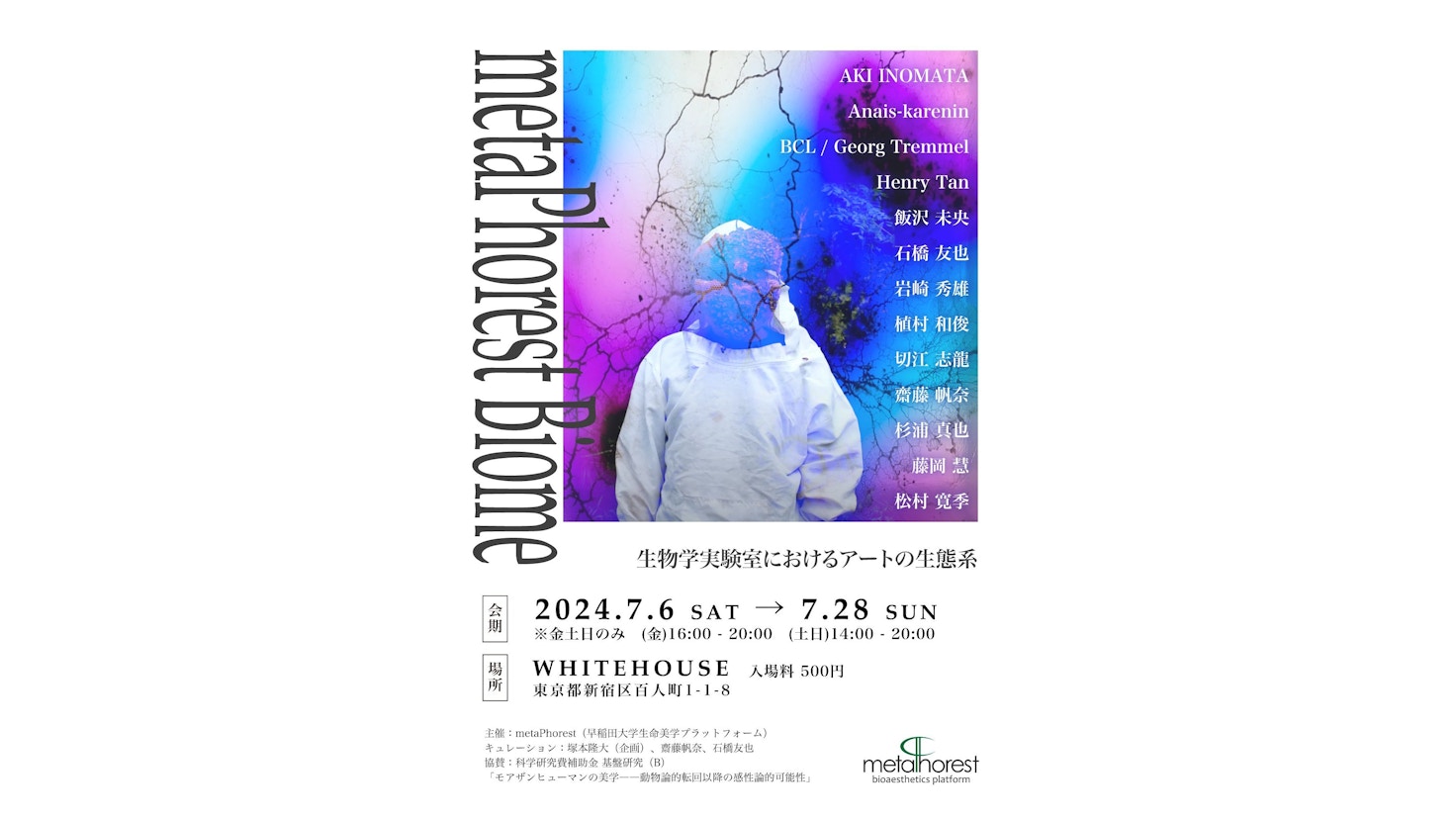 本展の主体である metaPhorest は、生命科学や生命論の展開を参照しつつ、「生命」を巡る美学・芸術の実験、研究、制作を行うための生命美学プラットフォームだ。2007年より、早稲田大学先端生命医科学センター岩崎秀雄研究室を拠点とし、生命に関心を持つアーティストが長期にわたり滞在し、実験設備を共有しながら制作を行ったり、あるいは関係する研究者や学生らが生命科学や人文学を横断する多領域的な活動を展開してきた。これらを通して、国内外での生命科学にまつわる芸術実践をリードしてきた。