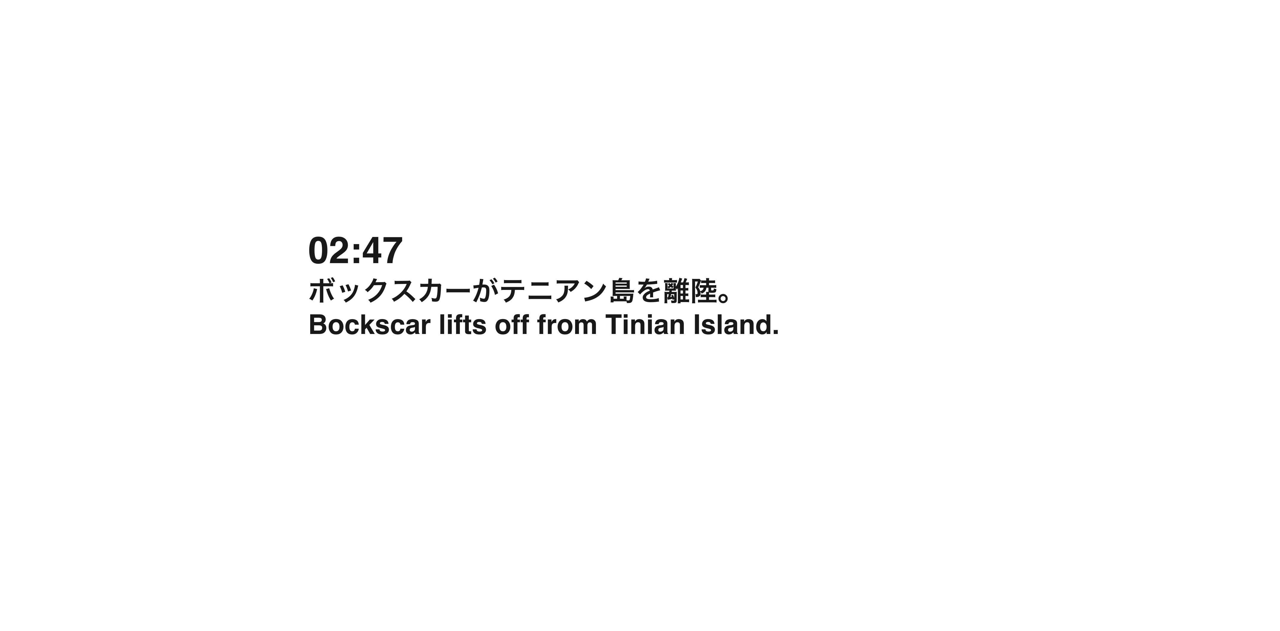 本作「A Place without a Catastrophe (カタストロフが訪れなかった場所)」は、原子爆弾投下のリスト最上位にありながら、破壊を免れた場所に関する作品だ。歴史的な出来事の周辺には、無数の「カタストロフが訪れなかった場所」が存在する。その意味において、本作品は「カタストロフが訪れなかったすべての場所」についてのドキュメントでもあるという。