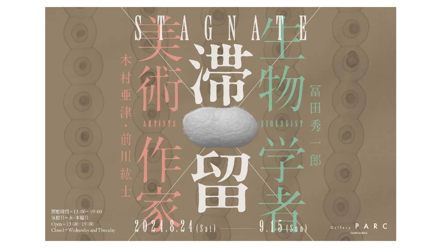 展覧会タイトルの「滞留」とは、本企画を表す言葉として三者が共通して適っているととらえた言葉だ。英語に訳した"STAGNATE"には、"停滞"や"淀み"といったネガティブな印象を与える意味もあるが、もとの流れからいったん距離を取り、アイディアやイメージを漂わせることは、新たな想像や実践を育む機会にもつながる。