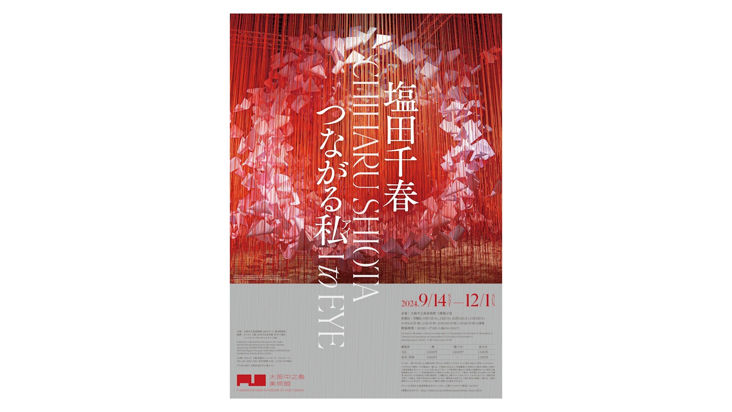 塩田千春(1972〜)は大阪生まれ。本展は、大阪では16年ぶりに開催される大規模個展。現在ベルリンを拠点として国際的に活躍する塩田は「生と死」という人間の根源的な問題に向きあい、作品を通じて「生きることとは何か」、「存在とは何か」を問い続けている。