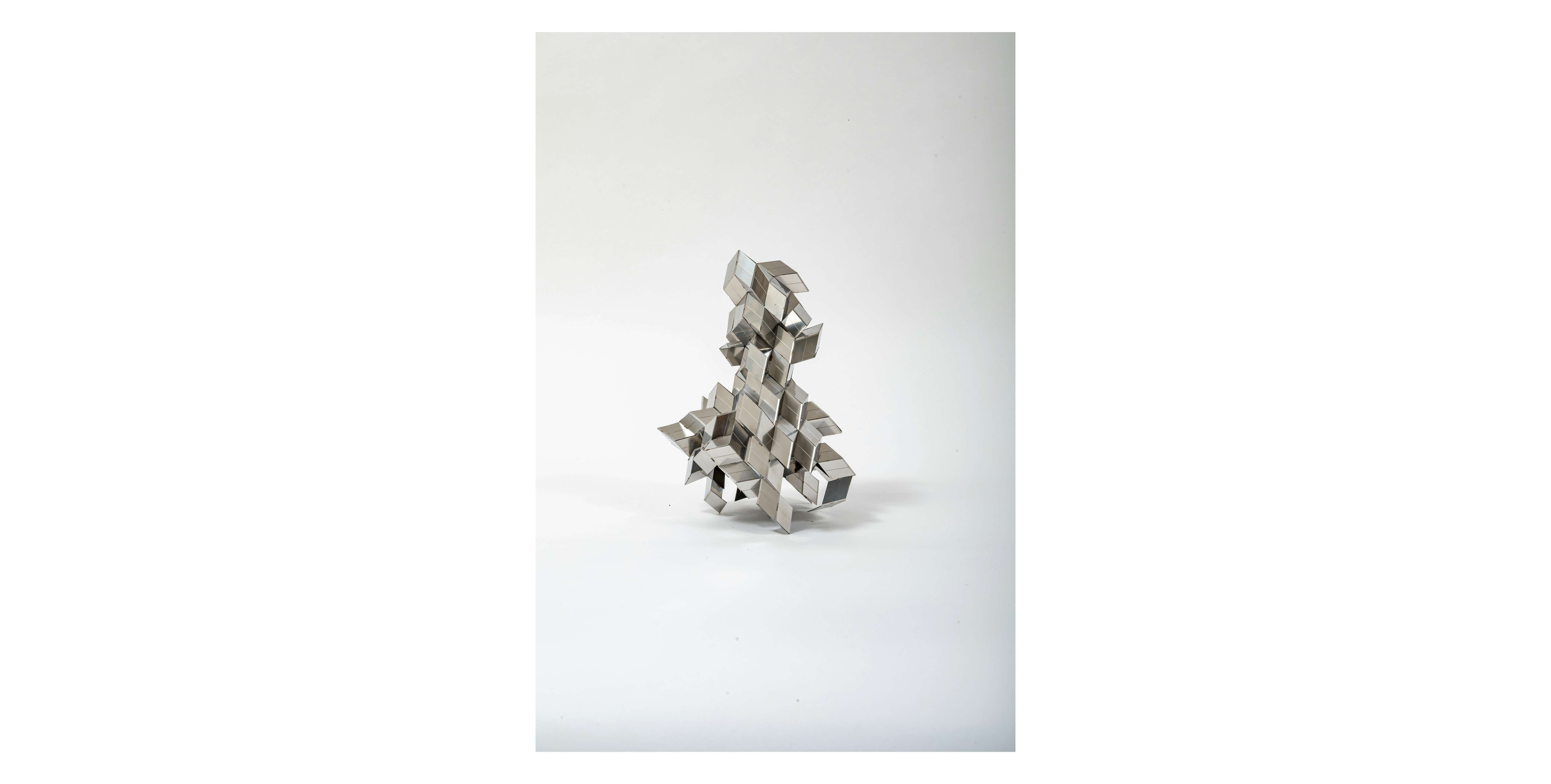 ミュンスター彫刻プロジェクトを訪れた際に「街中を彷徨っているうちに、すべてのものが彫刻に見えてきた」と語る伊佐治は、この現象を「彫刻酔い」と呼び、制作の起点になっていると言う。そのような視点を日常に持ち込むことで、カッターの刃や、プラスチックボトル、ボールペーンなど、あらゆる身の回りの既製品の素材やその構造を利用して、既知の存在から軽やかに逸脱させた彫刻をつくり出してきた。