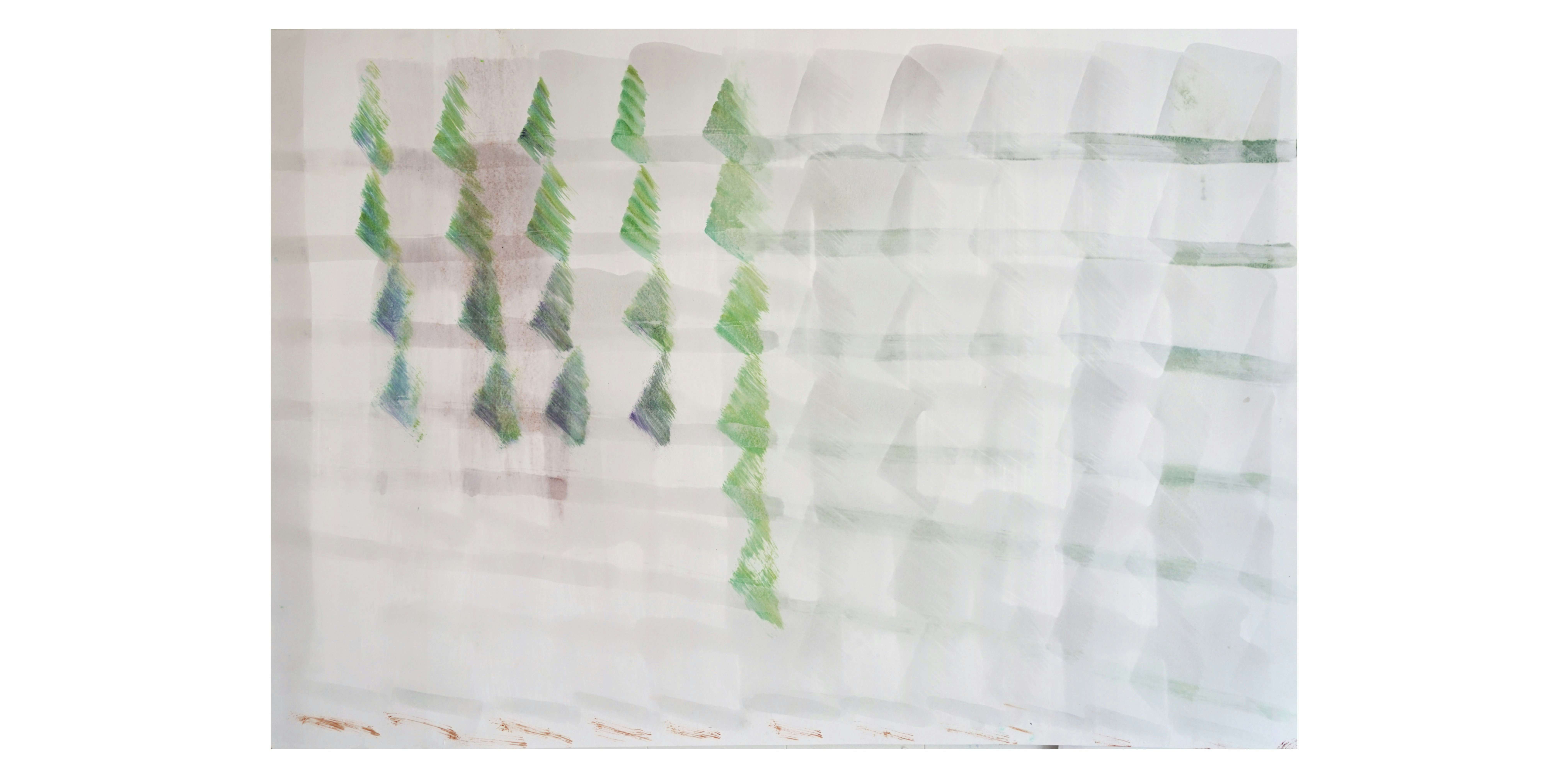 宮原はこの数年、絵画の伝統的な材料でパルプ紙がどう変化・変容するかを主な関心ごととしてきた。紙に下地を塗り、線を描き、壁にかけるという絵画のプロセスを何度も行き来することで紙が変化していく。下地であるダンマル樹脂が紙を透かすと、紙の表面と裏面がつながる。裏面に引かれた線が、表面に現れ、繰り返すうちに表と裏が曖昧になる。