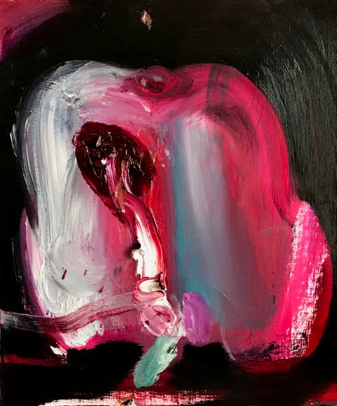 性愛と生きる上での痛みを題材に、モデルや自分自身との親密な関係を経て力強いペインティングを制作する松下まり子。自身の未来や宇宙を想像する心と、原始的で魔術的な「生」を希求する心を込めた「RAW」をタイトルに掲げ、新作個展を開催する。