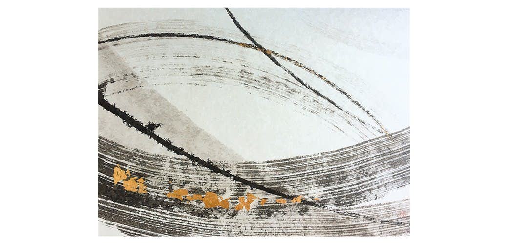 古来から「墨に五彩あり」と言われるほど表情豊かな墨を「にじみ」「すれ」「たまり」といった偶発的な表現を重要としながら、かねてより心惹かれてきた「線」で大胆に構成した作品を発表。墨や和紙といった日本人に馴染み深い画材が、アーティストの自由な発想と襖絵師としての確かな筆致により、約やかでありながら深い絵画に仕立てられている。