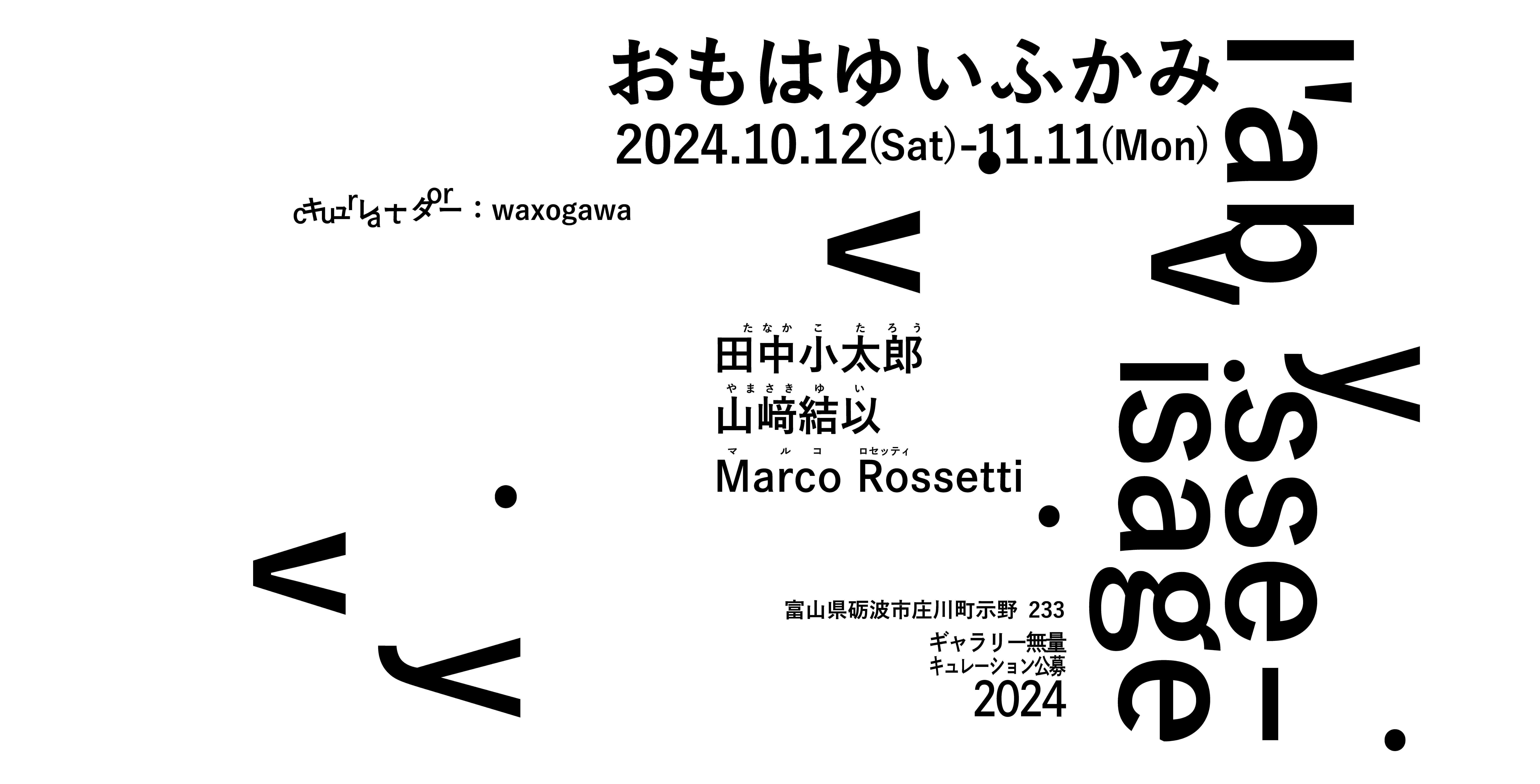 「今回のキュレーション展において、私が思考の足がかりとしたのはふたつの軸だ。ひとつは、東京中心主義的に見える現代アートの趨勢に対して、富山ないし日本海側の『田舎』的な風景や地政学的/空間的な状況が、どう機能するのか、ということ。そしてもうひとつは、ギャラリー無量内部にある白い壁と、畳のある部屋、仏間と神棚、ギャラリースペースの混在する雑食的な支持体をもとに、どのような展示が立ち上がるのか、という関心。このふたつだ。