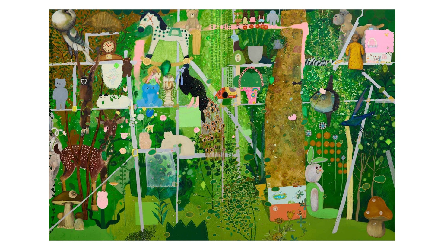 庭、植物、季節、空気の匂い、光、宇宙、動物、ぬいぐるみ、子供、部屋。長井作品のモチーフは、彼女がいつも頭の中にストックしている、小さい頃から親しんだもの、日常のドラマチックな瞬間、夢の景色などだ。それらを独自の視点とイマジネーションで有機的につなぎ、色彩のパズルのように共鳴させ、「未知の居心地がいい場所、見てみたい光景」として、森羅万象が輝く新しく自由な絵画空間に誘なう。