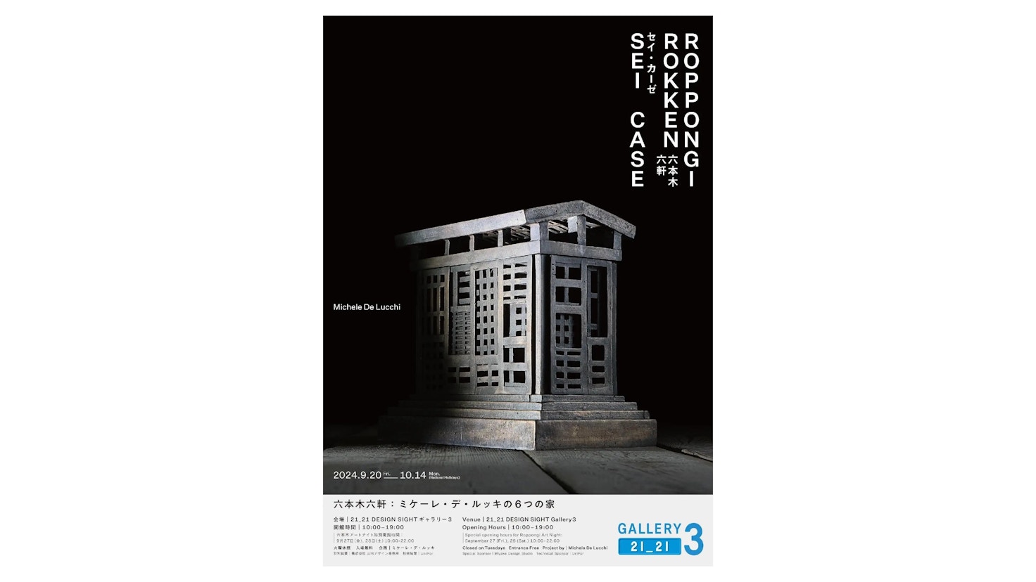 発端は2018年。21_21 DESIGN SIGHTで交わされたデ・ルッキと三宅一生との対話をきっかけに始動した本展は、ギャラリー3の空間のためのプロジェクトであり、会場には木製3点、ブロンズ製3点の「ロッジア」=6つの家(セイ カーゼ)がヴィクトル・コサコフスキー監督による映像作品と、制作過程をとらえた映像とともに展示。デ・ルッキは、会場のある六本木の地名がかつて存在した6軒の武家屋敷に由来するという一説を知り、6つの家の彫刻作品とのあいだに偶然の一致を見出し、本展を「六本木六軒」と名づけた。