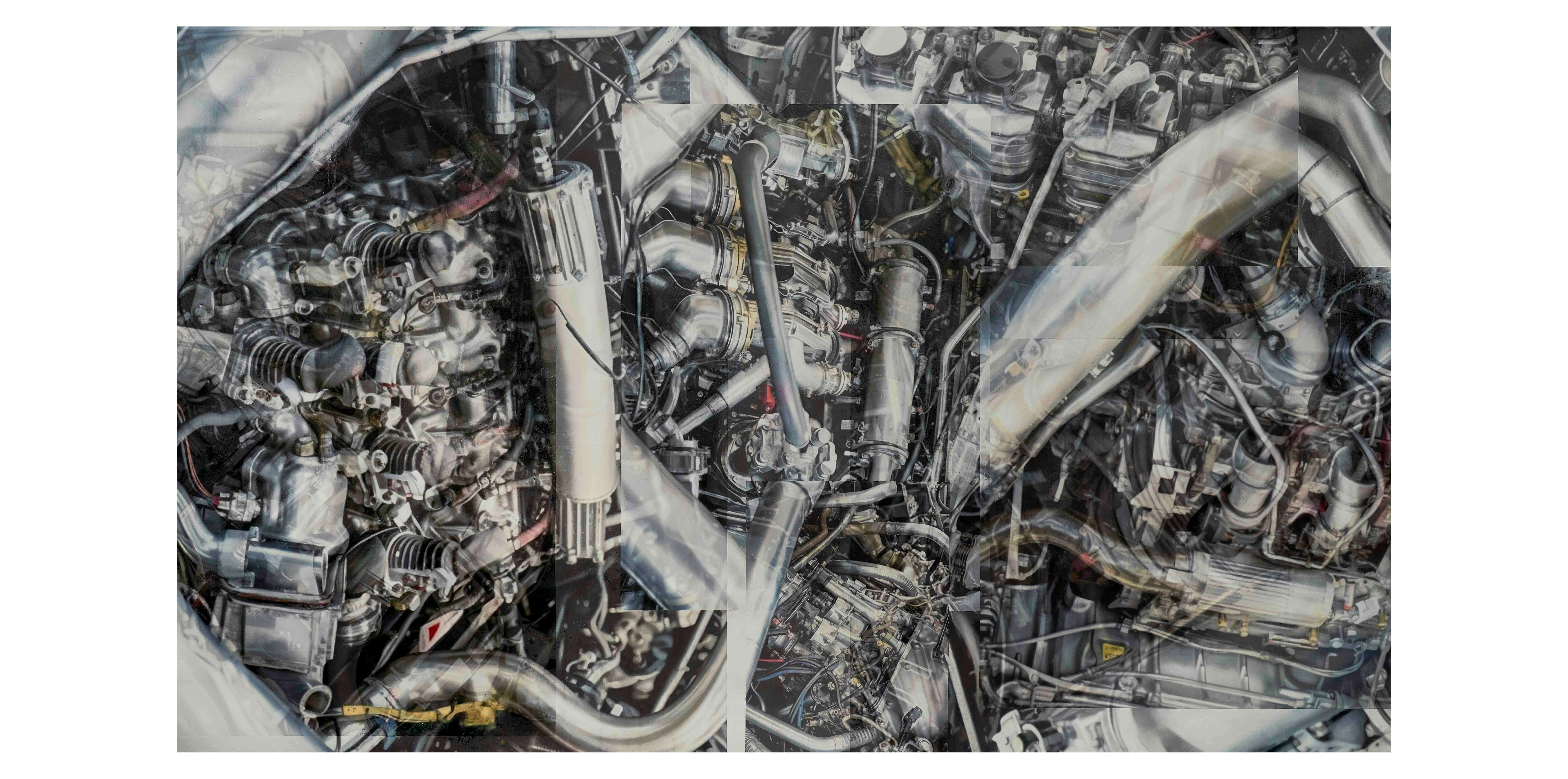 さらには牧田が機械やエンジンを描き始めた初期からの特徴として視点の誘導が挙げられるが、画面上に立体的に絡みあっている要素はそのほとんど同一レイヤー上にあり、奥行きといった視覚的なヒエラルキーを取り除かれている。とくに今回の牧田の生成された画像をベースにした作品群は伝統的な西洋絵画における明暗や遠近によって生み出されるフォーカスポイントよりも、浮世絵にも見られる平面的に広がった視点誘導に近く、構成要素のサイズも誇張され歪められ、尺度が現実に即していないからこそよりリアルに見える機械風景を提示している。