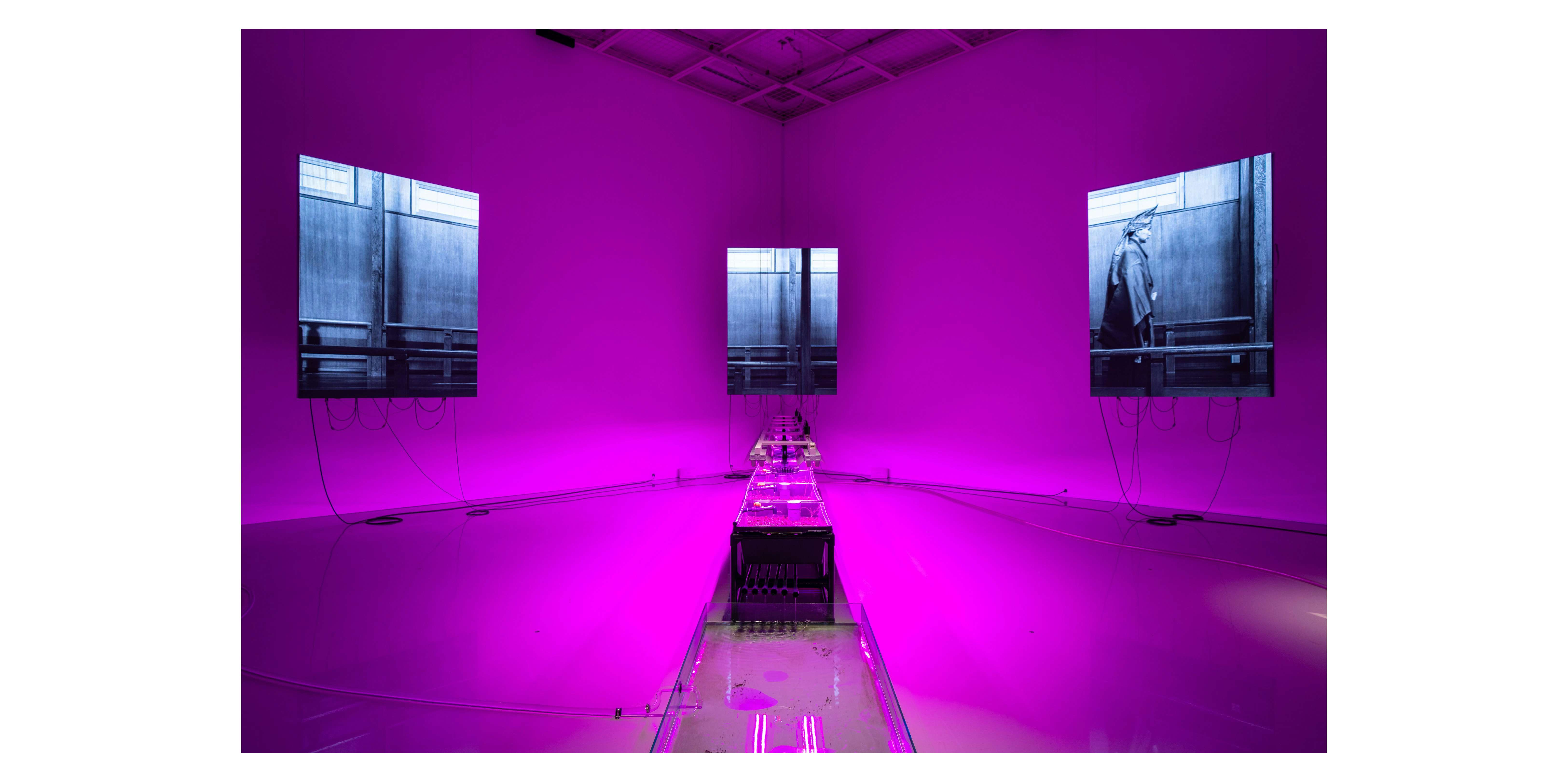 本展では、水槽やプランターなどをホースでつなぎ、水やバクテリアを循環させて自律した生態系を構築する渡辺の代表作《Sans room》とともに、能の演目『翁』にインスピレーションをえて制作した新作能の映像インスタレーションなどを展示。『翁』では人間に神が「宿」り、祈りを捧げ、再び人間に戻るという、人間・神・自然の循環的な関係、日本列島に眠るマージナルな自然観が描かれる。また、渡辺は現代において、とくに新型コロナウイルスの流行以来、人間の身体を「宿」主としてウィルスが生存している意識や、国家・コミュニティを越え、他種や他者との共生へ向かう感覚が高まっているのではないかと指摘している。