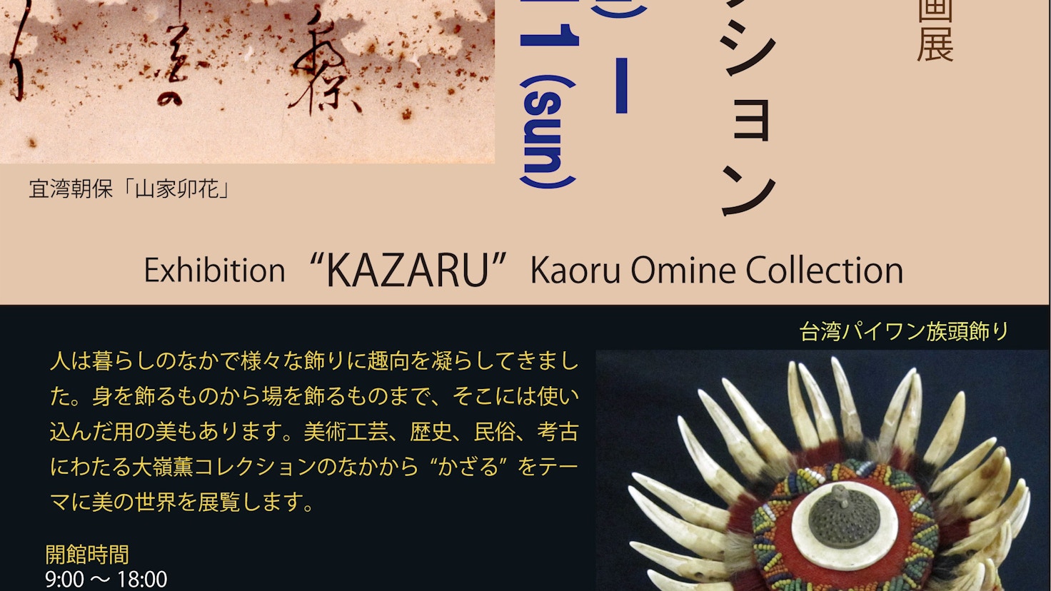 本展では、美術工芸、歴史、民俗、考古にわたる大嶺薫コレクションのなかから「かざる」をテーマに、人は暮らしの中の様々な飾りや、身を飾るものから場を飾るものまで、多彩な顔ぶれがそろう。