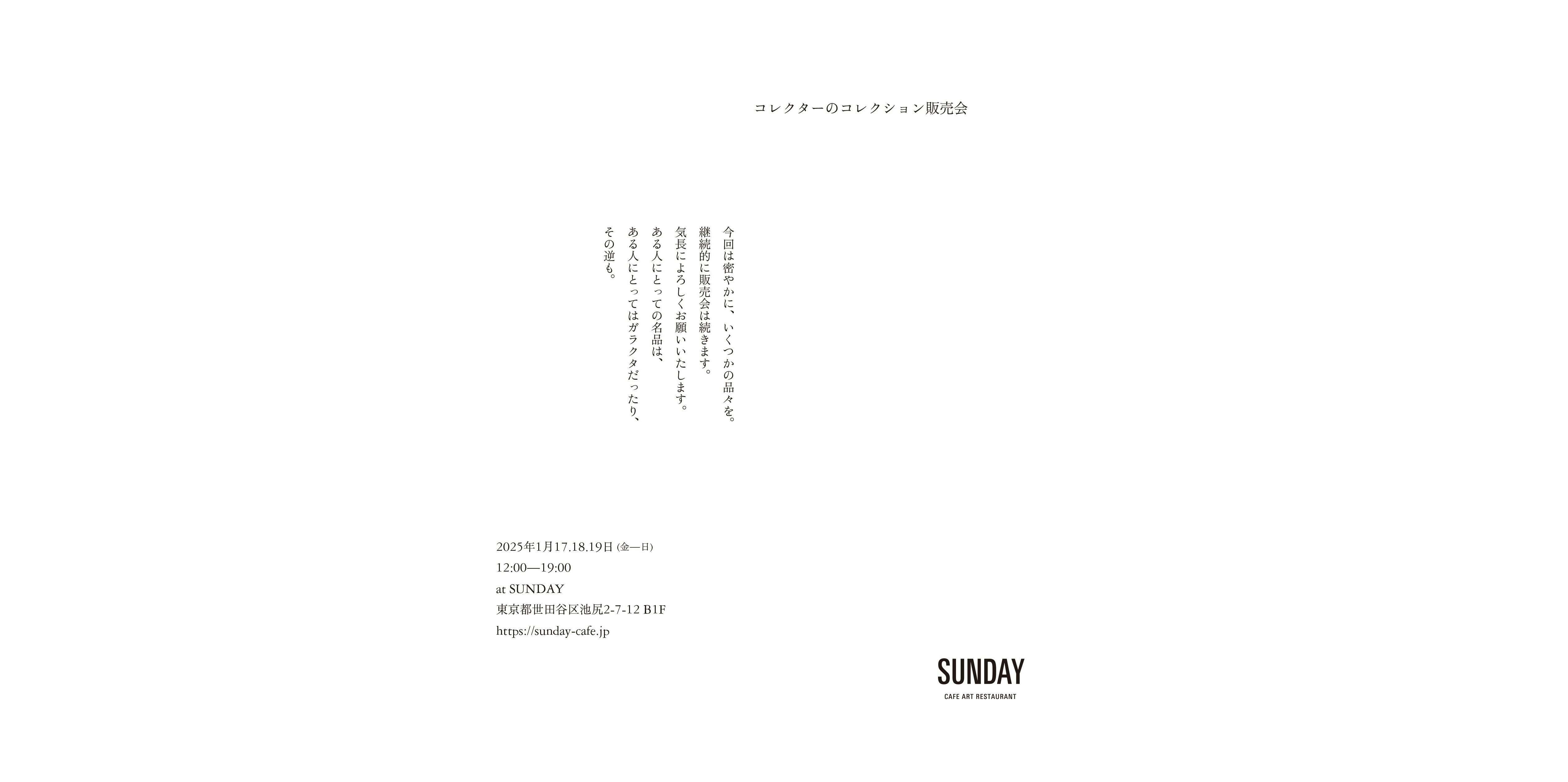 なお、本展は、同施設内CAFEスペース・SUNDAYでの「コレクターのコレクション販売会」と同時開催となる。